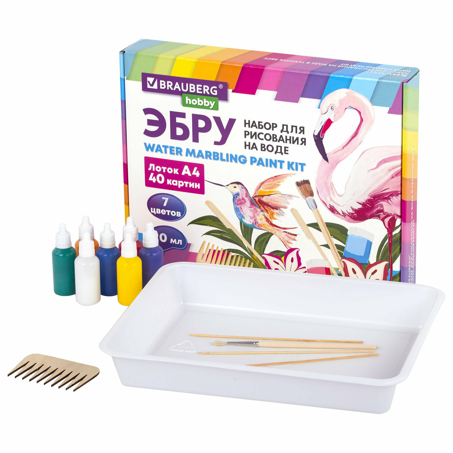 Купить Эбру рисование на воде набор для творчества для девочек и мальчиков 7 цветов по 20 мл, лоток А4, BRAUBERG HOBBY, 665354