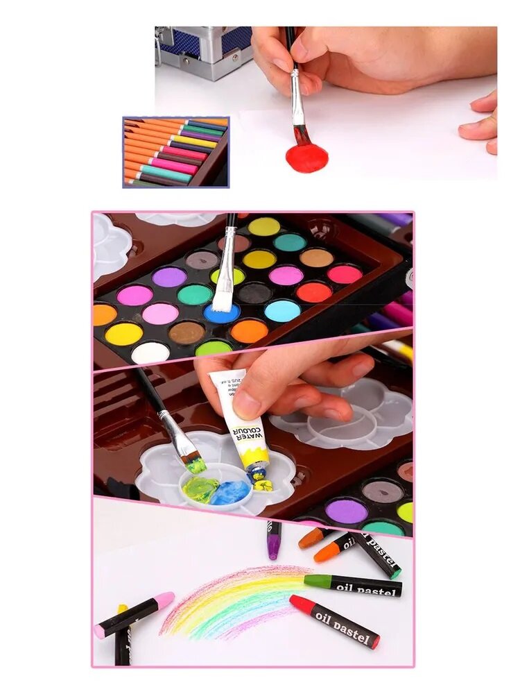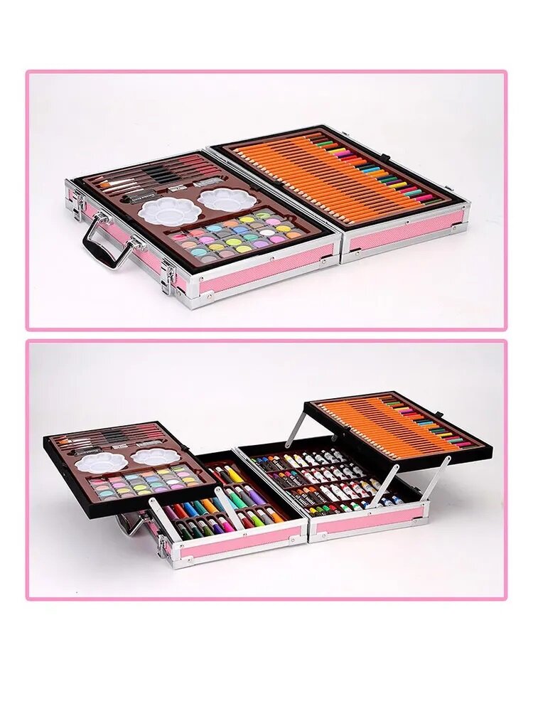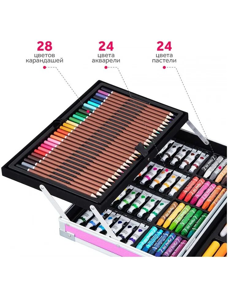 | Комплектация | Масляные краски 24 шт, Пастель 24 шт, Фломастеры 33 шт, Цветные карандаши 28 шт, Акварельные краски 24 шт, Кисти 4 шт, Контейнеры для красок 2 шт, Простые карандаши 2 шт, Замешанный ластик, Ластик, Точилка, Стильный чемодан. |