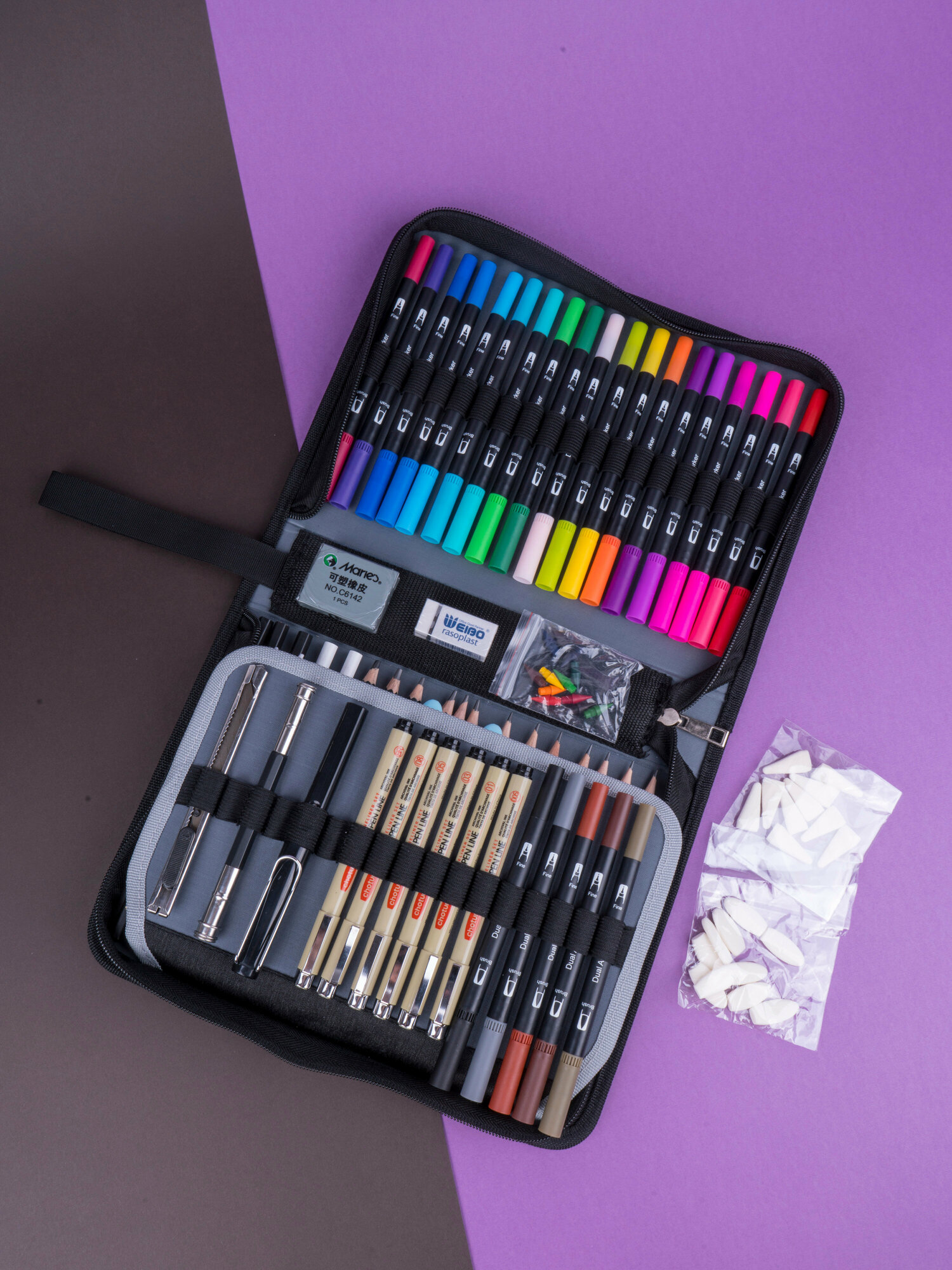 | Комплектация | 12 двухсторонних фломастеров-линеров; 6 черных линеров разной толщины; 3 угольных карандаша; 2 белых карандаша; 1 удлинитель для карандаша; 1 канцелярский нож; вечный карандаш и грифели; 14 простых карандашей; 1 клячка; 1 ластик; |
