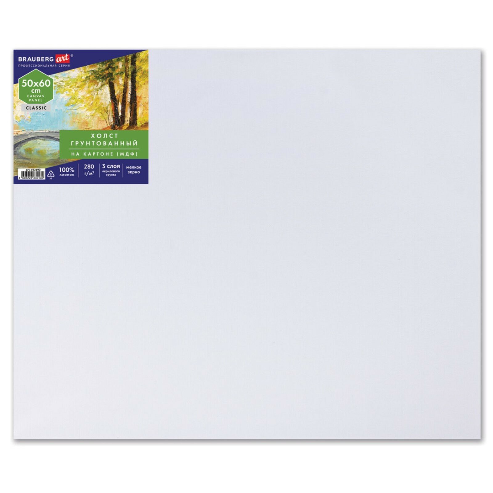 Холст на картоне (МДФ), 50*60см, 280г/м2, грунтованный, 100% хлопок, BRAUBERG ART CLASSIC, 192190