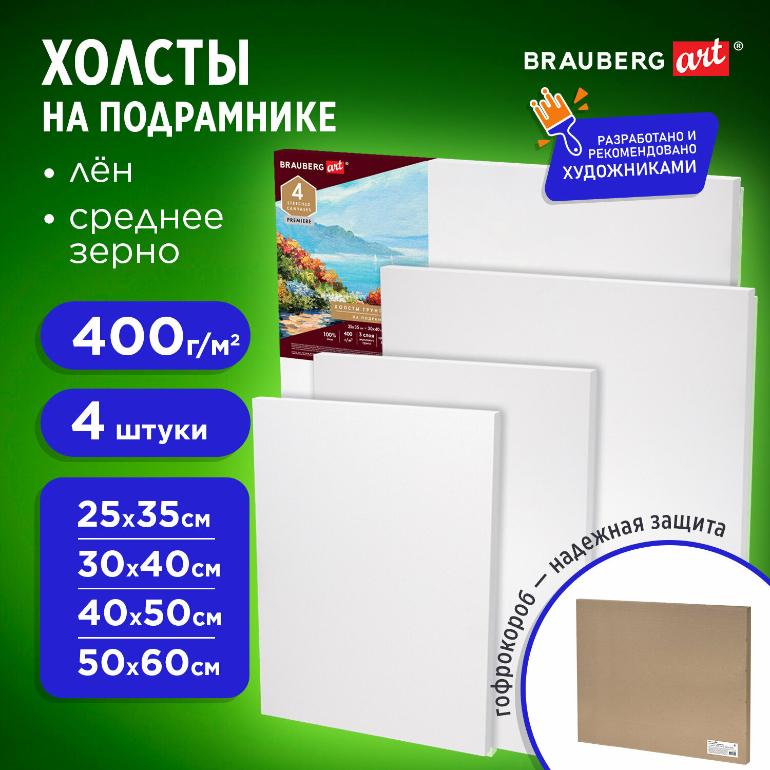 Холсты на подрамнике в коробе, Набор 4 шт. (25х35 см, 30х40 см, 40х50 см, 50х60 см), 400 г/м2, лен, Brauberg Art Premiere, 880339 интересное: