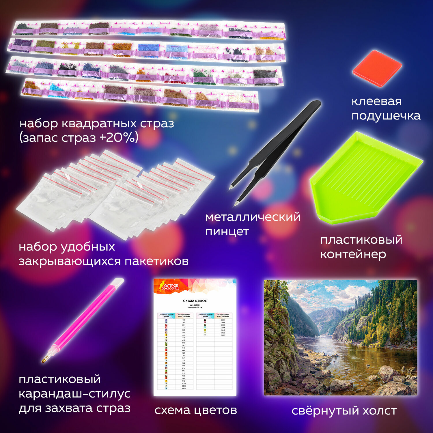 | Особенности | лоток для страз / пинцет / подрамник / стилус / холст |