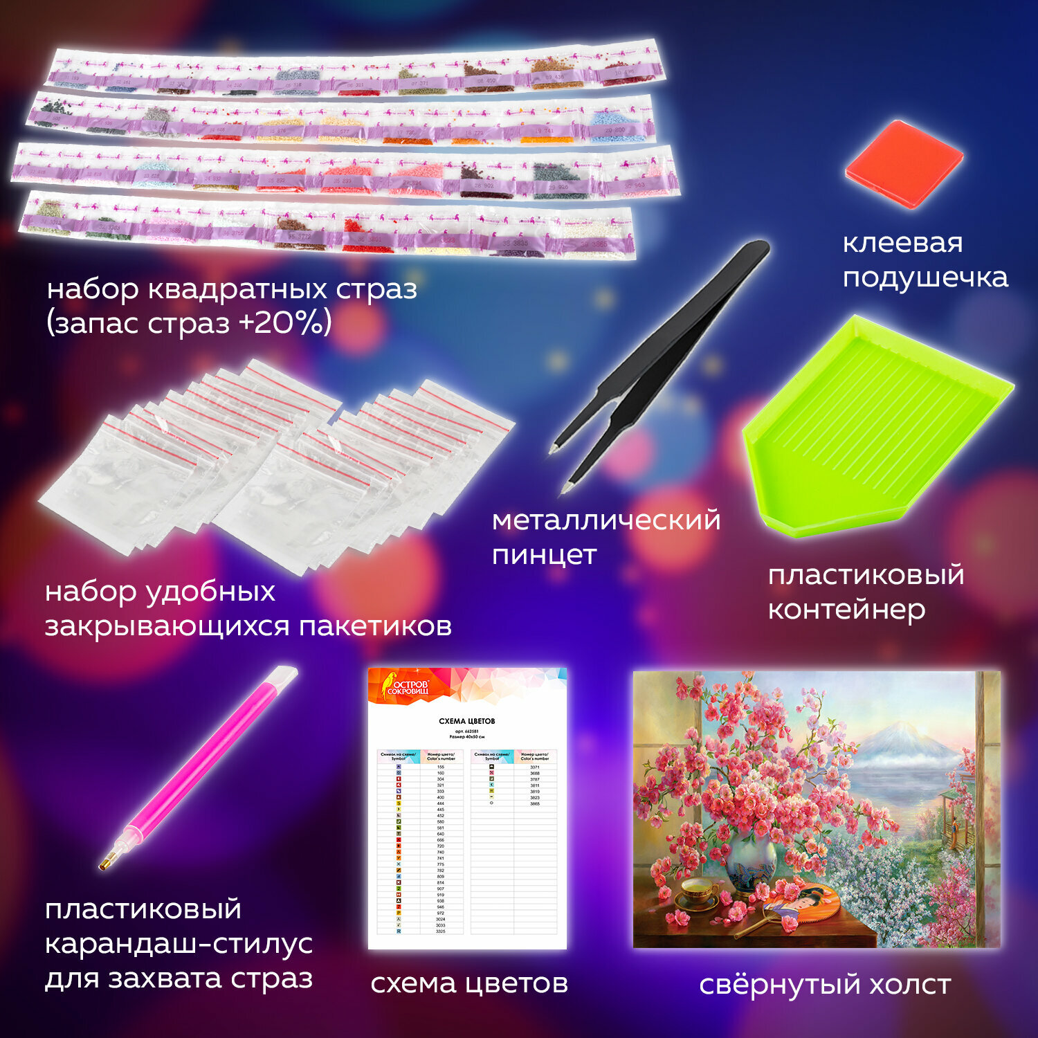 | Особенности | лоток для страз / пинцет / подрамник / стилус / холст |