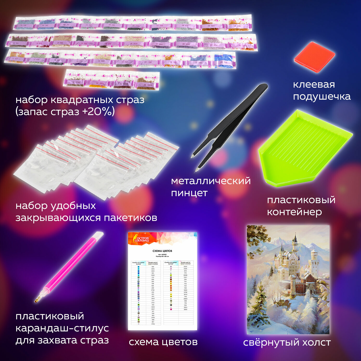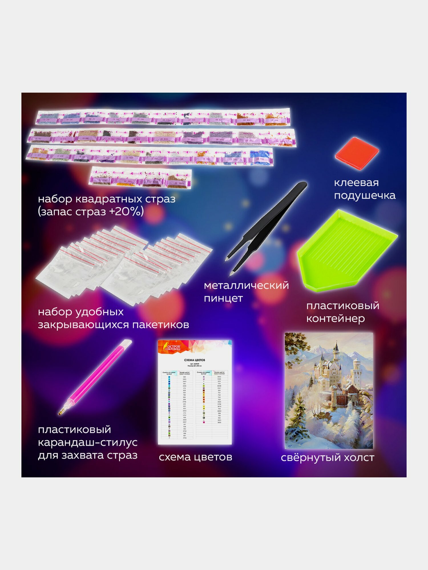 | Особенности | лоток для страз / пинцет / подрамник / стилус / холст |