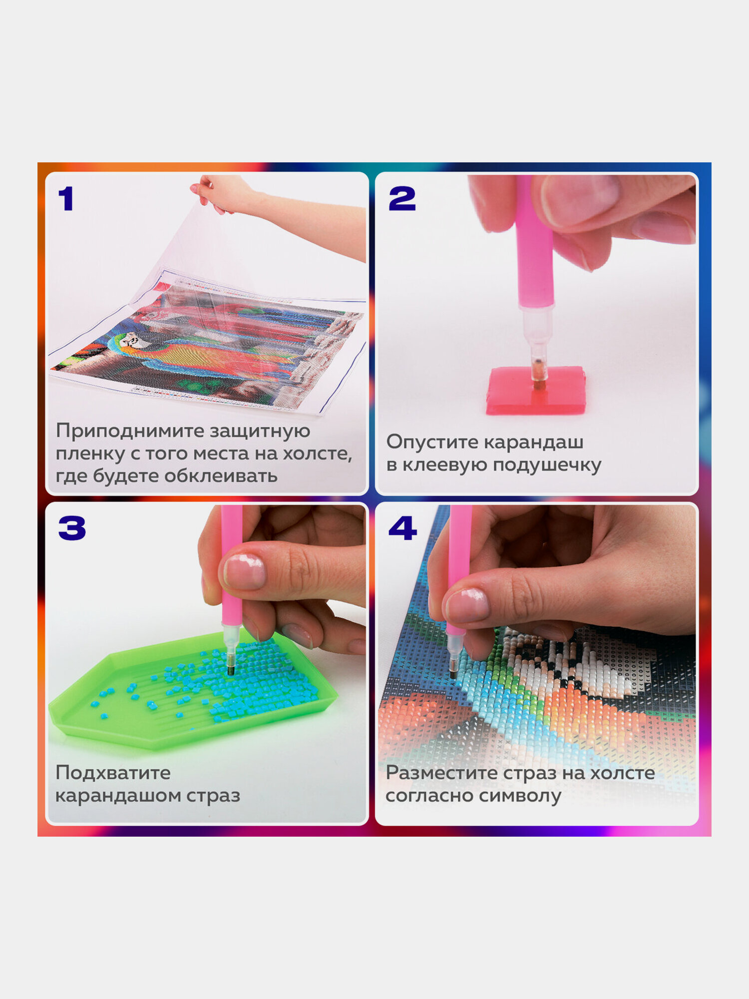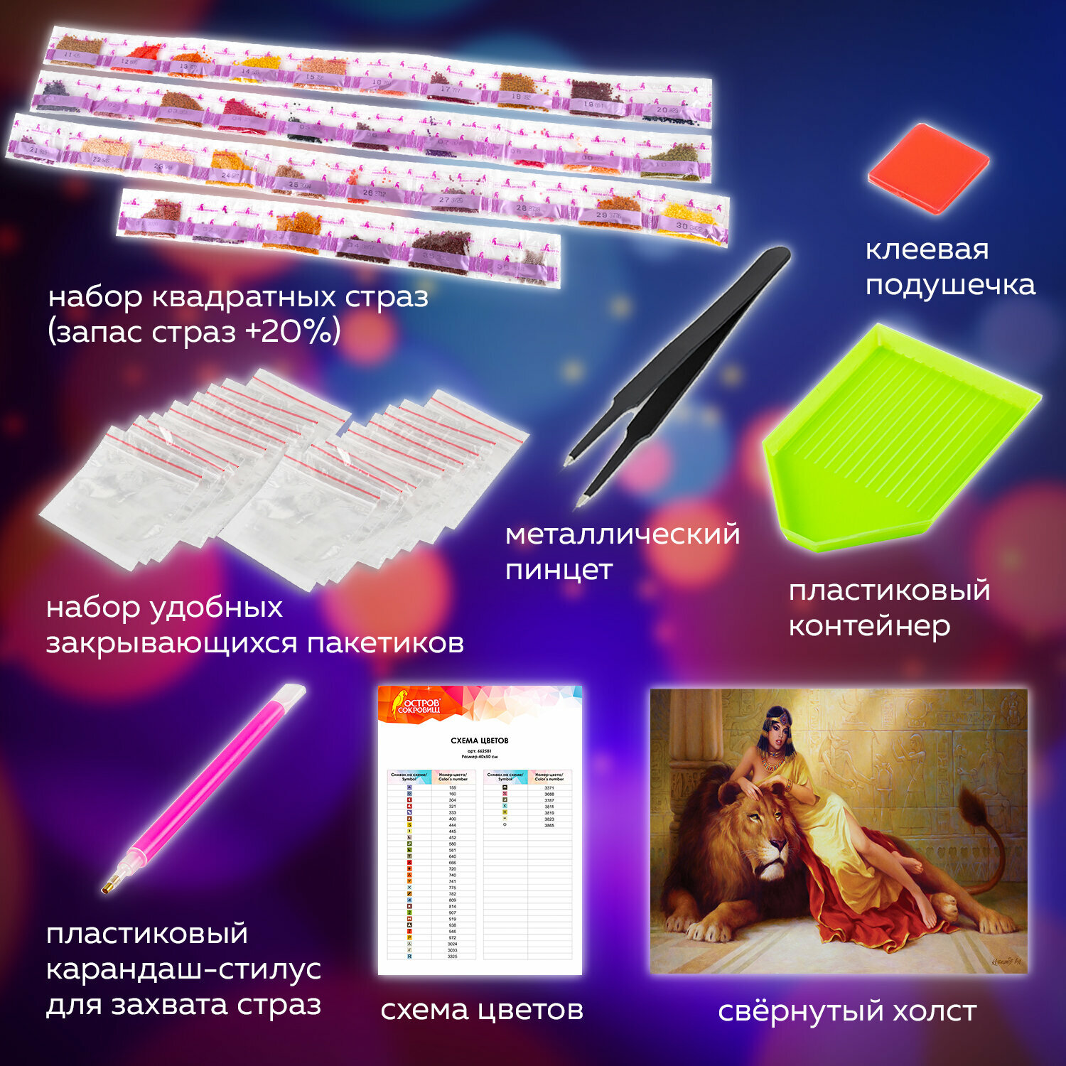 | Особенности | лоток для страз / пинцет / подрамник / стилус / холст |