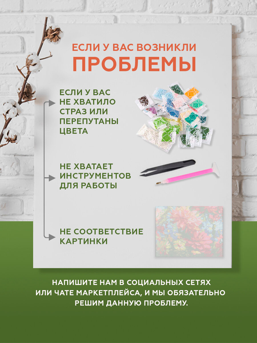 | Комплектация | - холст без подрамника; - схема выкладки; - набор круглых страз; - стилус; - пинцет; - лоток для страз. |
