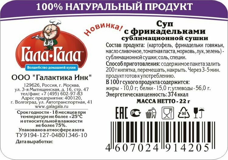 | Состав | сублимационной сушки: картофель, фрикадельки говяжьи, масло сливочное, томатная паста, лук, морковь, зелень; соль, специи. |
