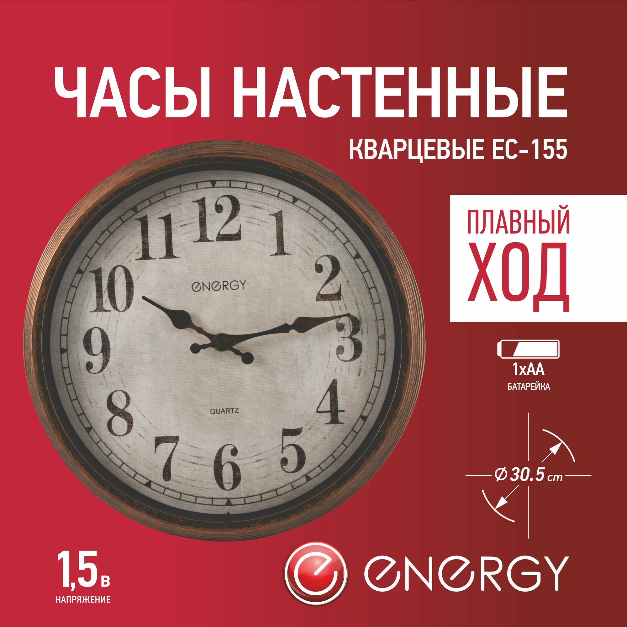Часы настенные бесшумные, большие, круглые ENERGY ЕС-155, диаметр 30.5 см