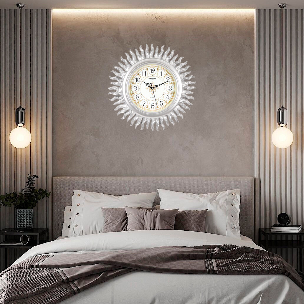Купить Настенные большие серебристые часы в форме солнца M1005А SM/Серебряные часы на стену/Часы солнце/Диаметр 47 см/Бесшумные часы в спальню/декоративные часы в гостиную