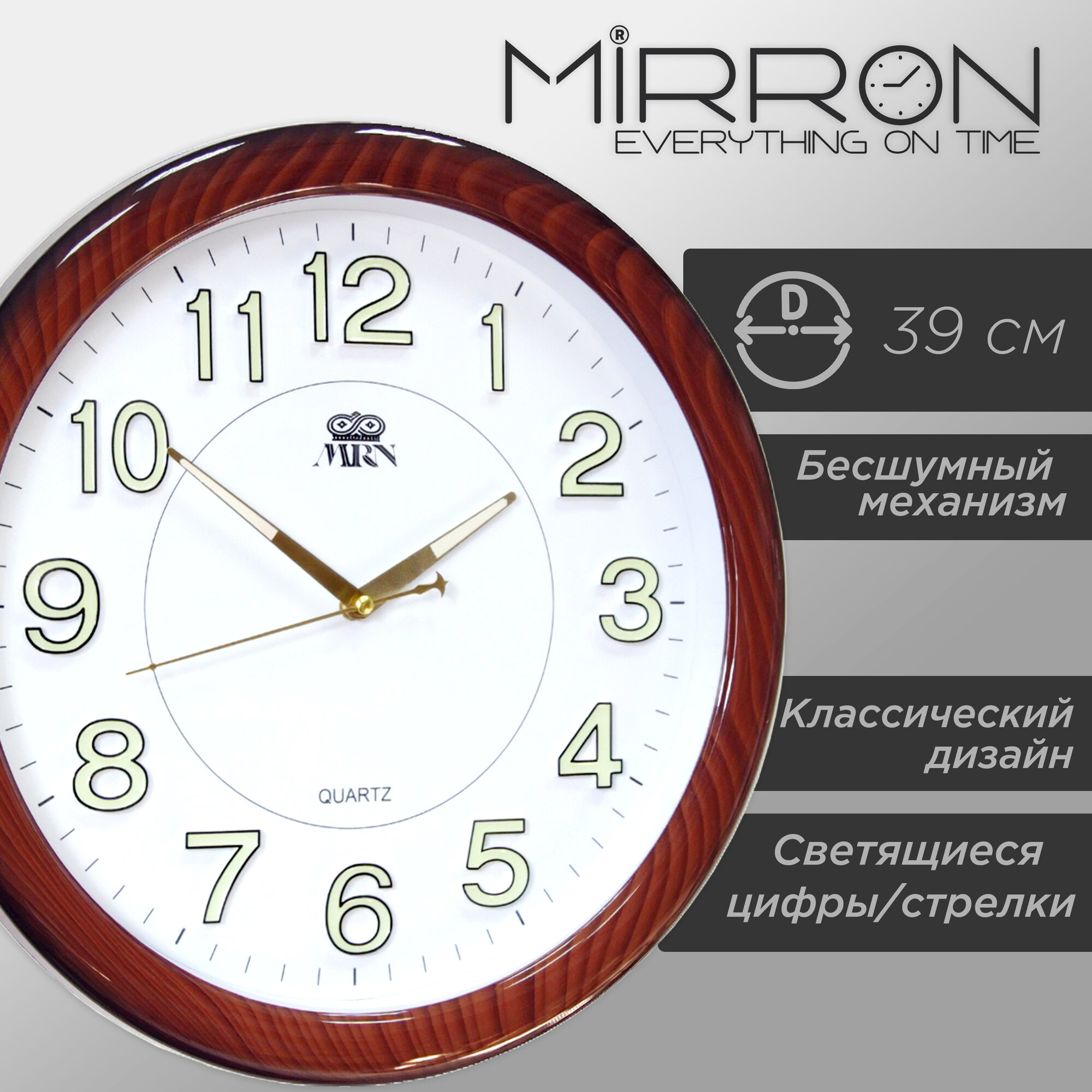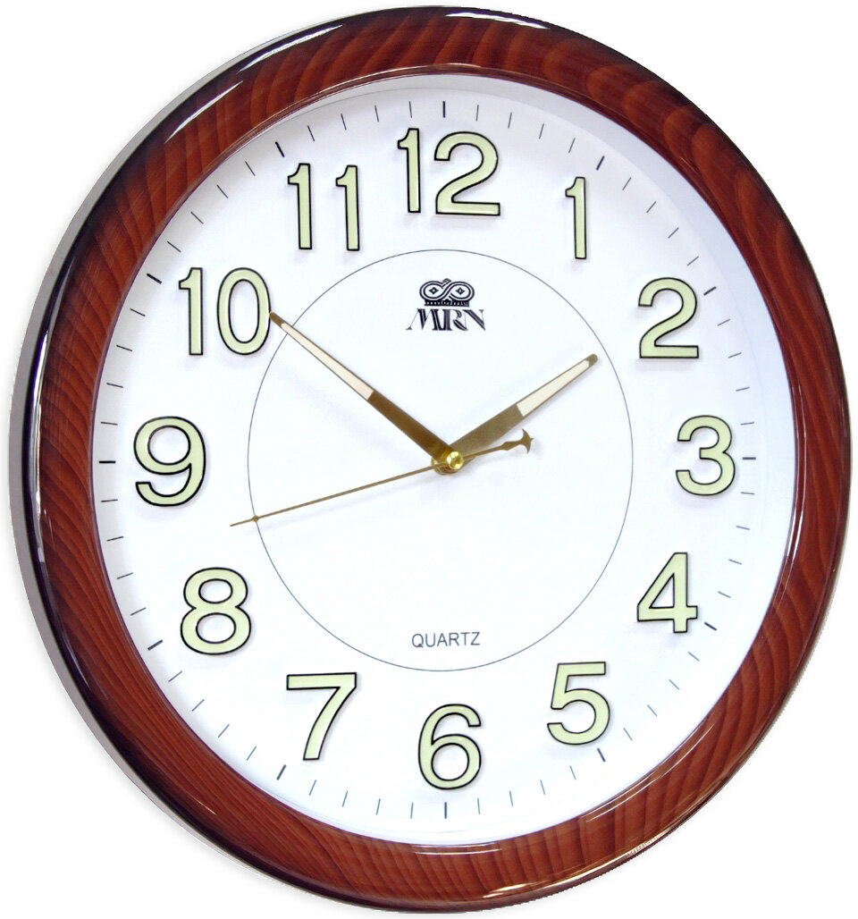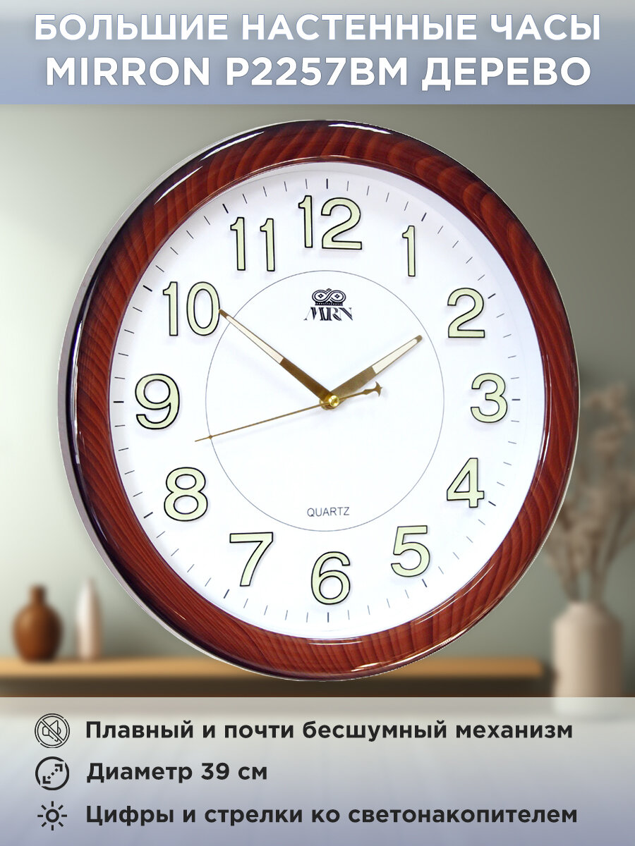 Купить Настенные кварцевые часы MIRRON P2257BM ДКБ/Большие круглые часы/39 см/Белый (светлый) циферблат/Цифры и стрелки со светонакопительным материалом (светящиеся цифры и стрелки)/Коричневый (под дерево) цвет корпуса/Накладные цифры/Бесшумный плавный механизм