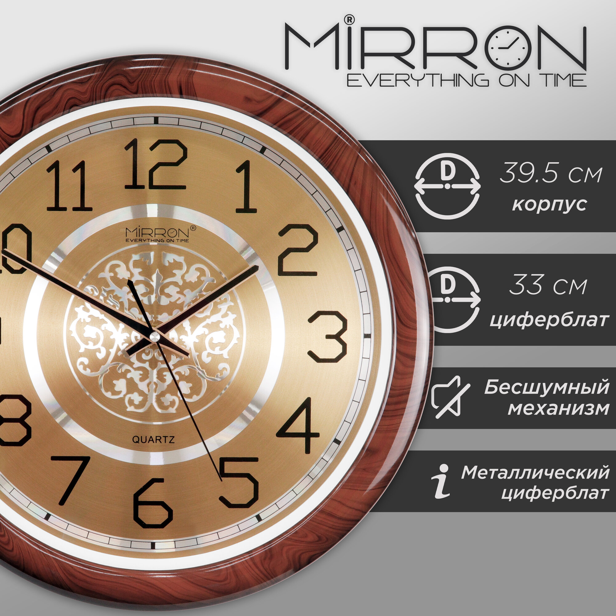 Большие настенные часы MIRRON P2599C ДКЗ/Круглые часы с диаметром 39.5 см/Металлический циферблат/Коричневый цвет корпуса/Золотой (светлый) циферблат/Большие арабские цифры/Часы в минималистичном дизайне/Часы с узорами интересное:
