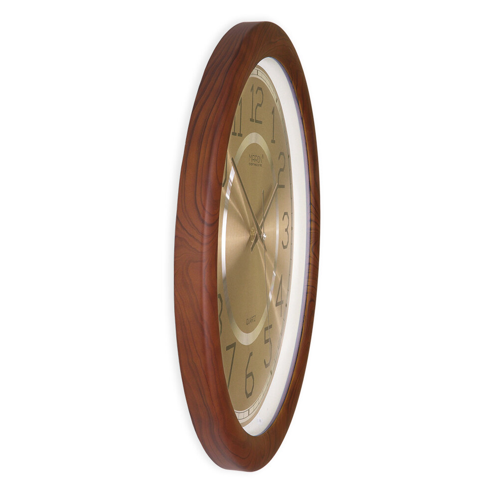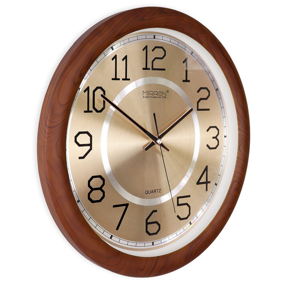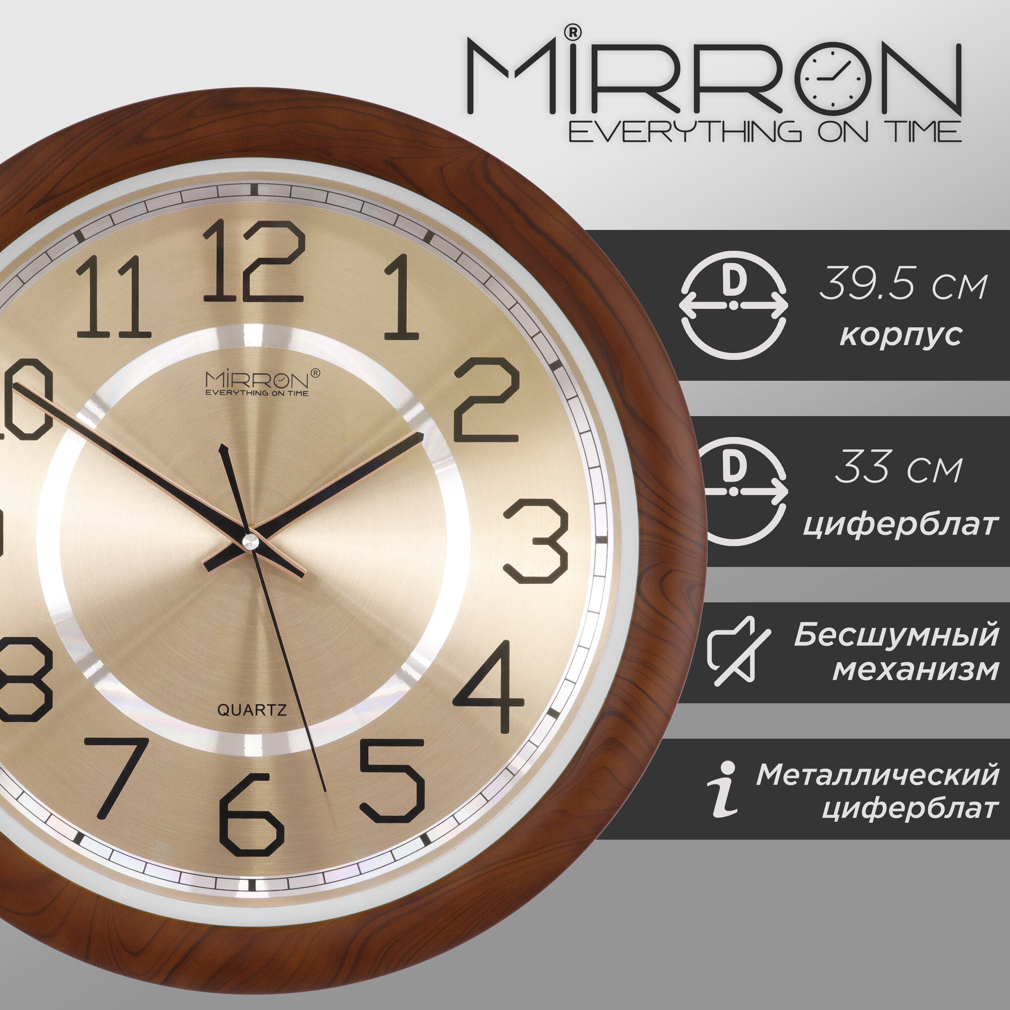Большие настенные часы MIRRON P2599C ВДЗ/Круглые часы с диаметром 39.5 см/Металлический циферблат/Коричневый цвет корпуса/Золотой (светлый) циферблат/Большие арабские цифры/Часы в минималистичном дизайне/Часы с узорами интересное: