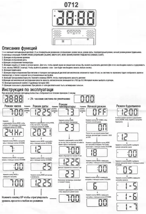 | Комплектация | Часы настольные электронные, USB-кабель питания, Инструкция |