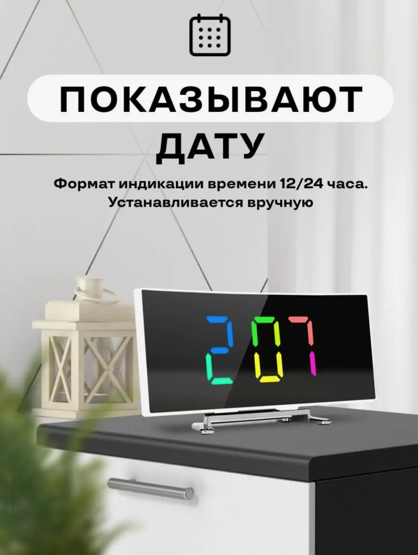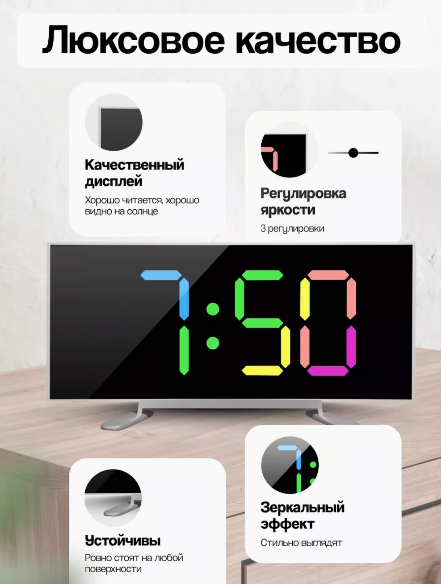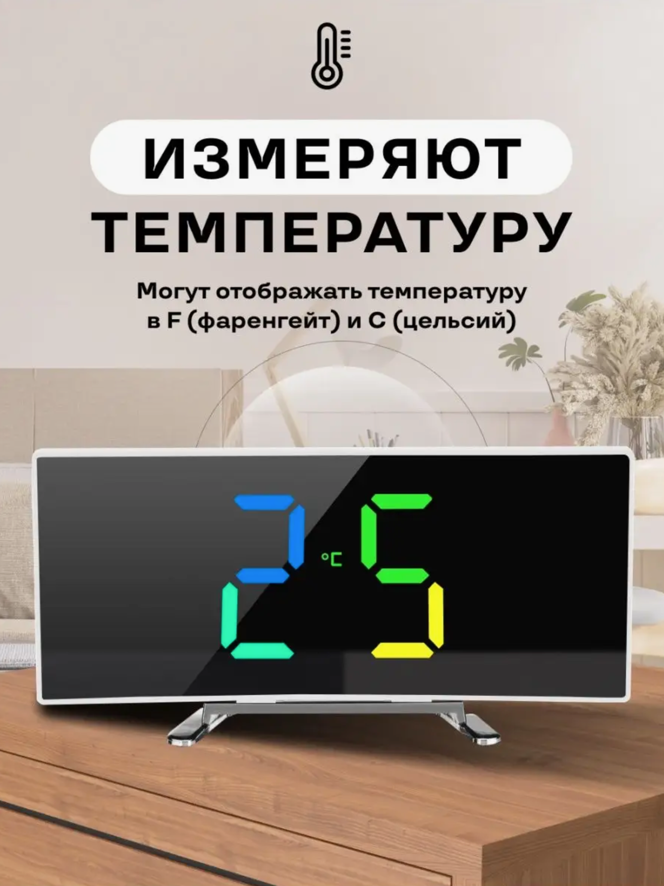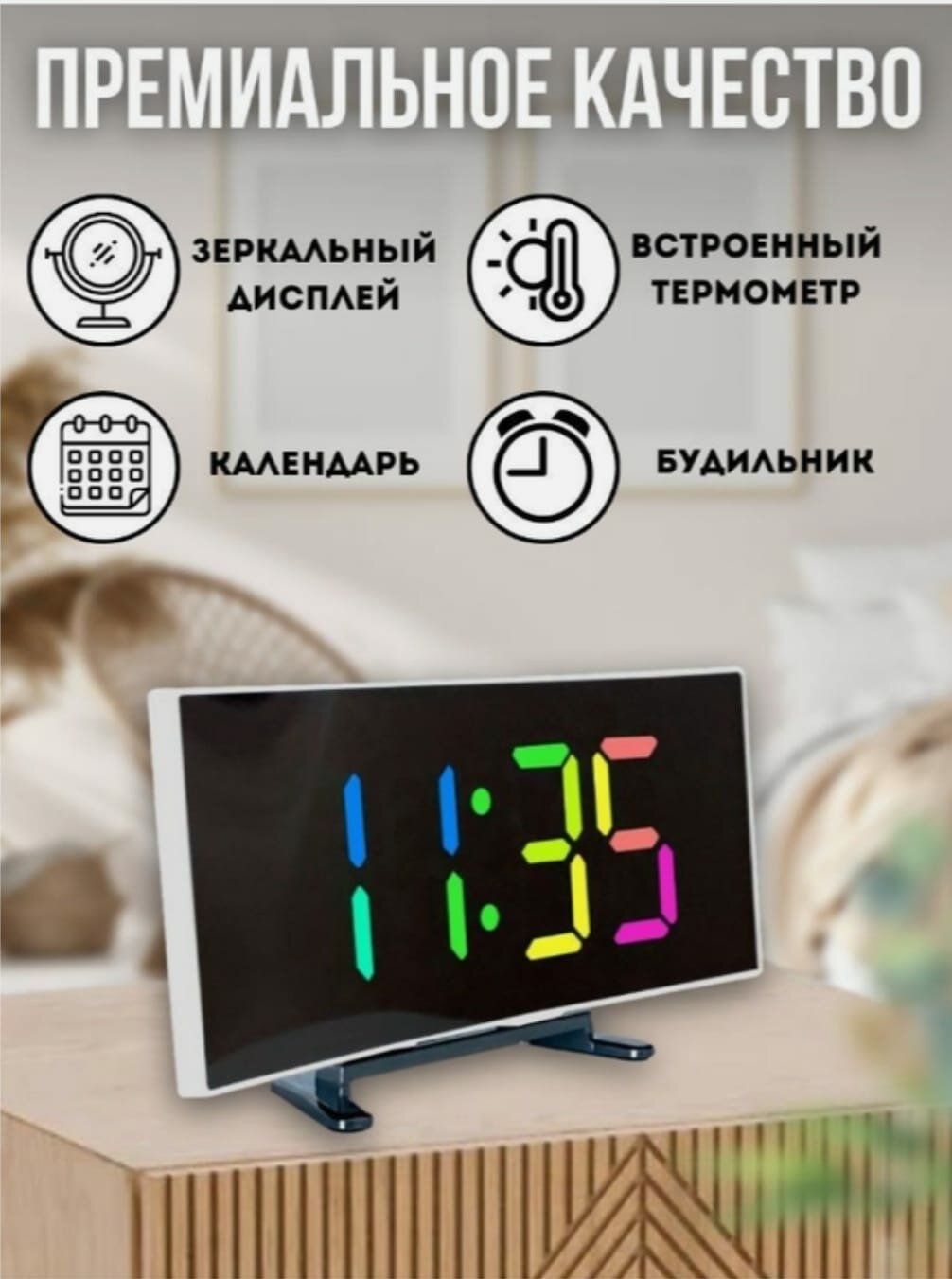 | Дополнительная информация | зеркальный светодиодный будильник, оснащен функциями автоматического измерения температуры, автоматического уменьшения яркости свечения ночью |