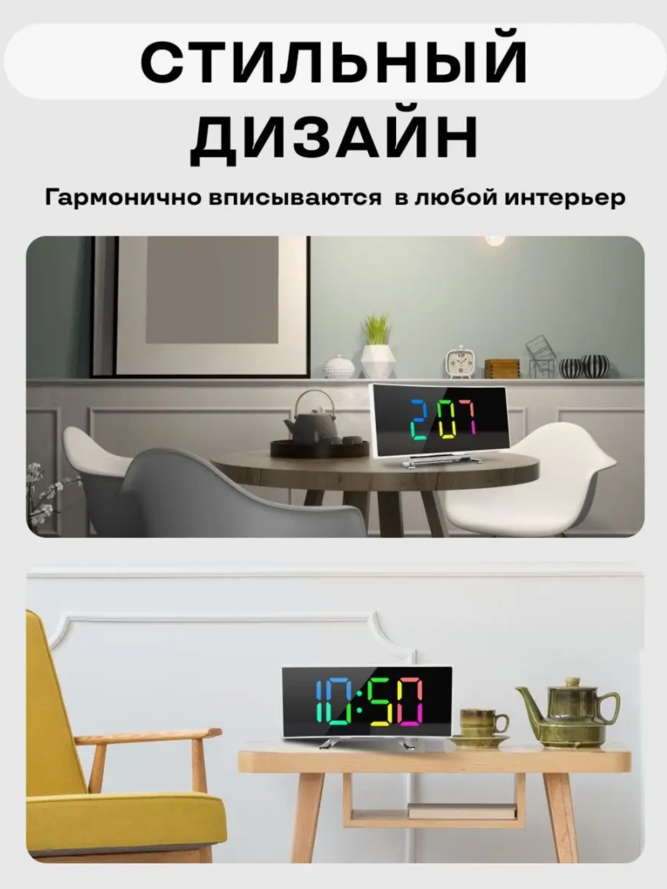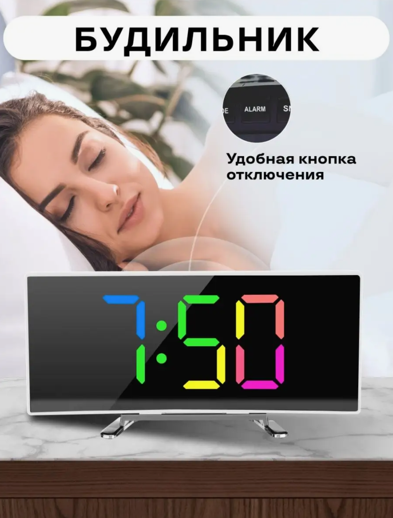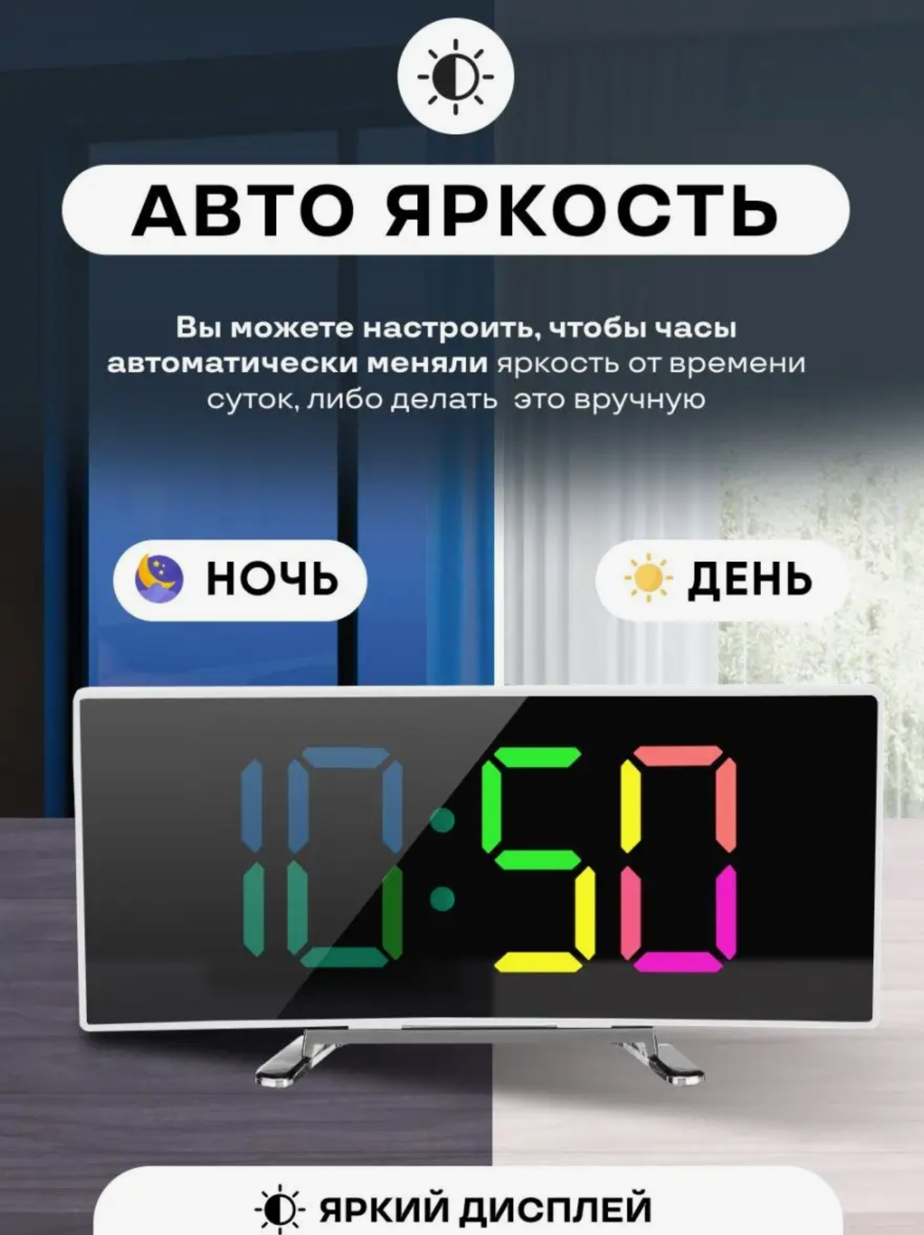 | Дополнительная информация | зеркальный светодиодный будильник, оснащен функциями автоматического измерения температуры, автоматического уменьшения яркости свечения ночью |