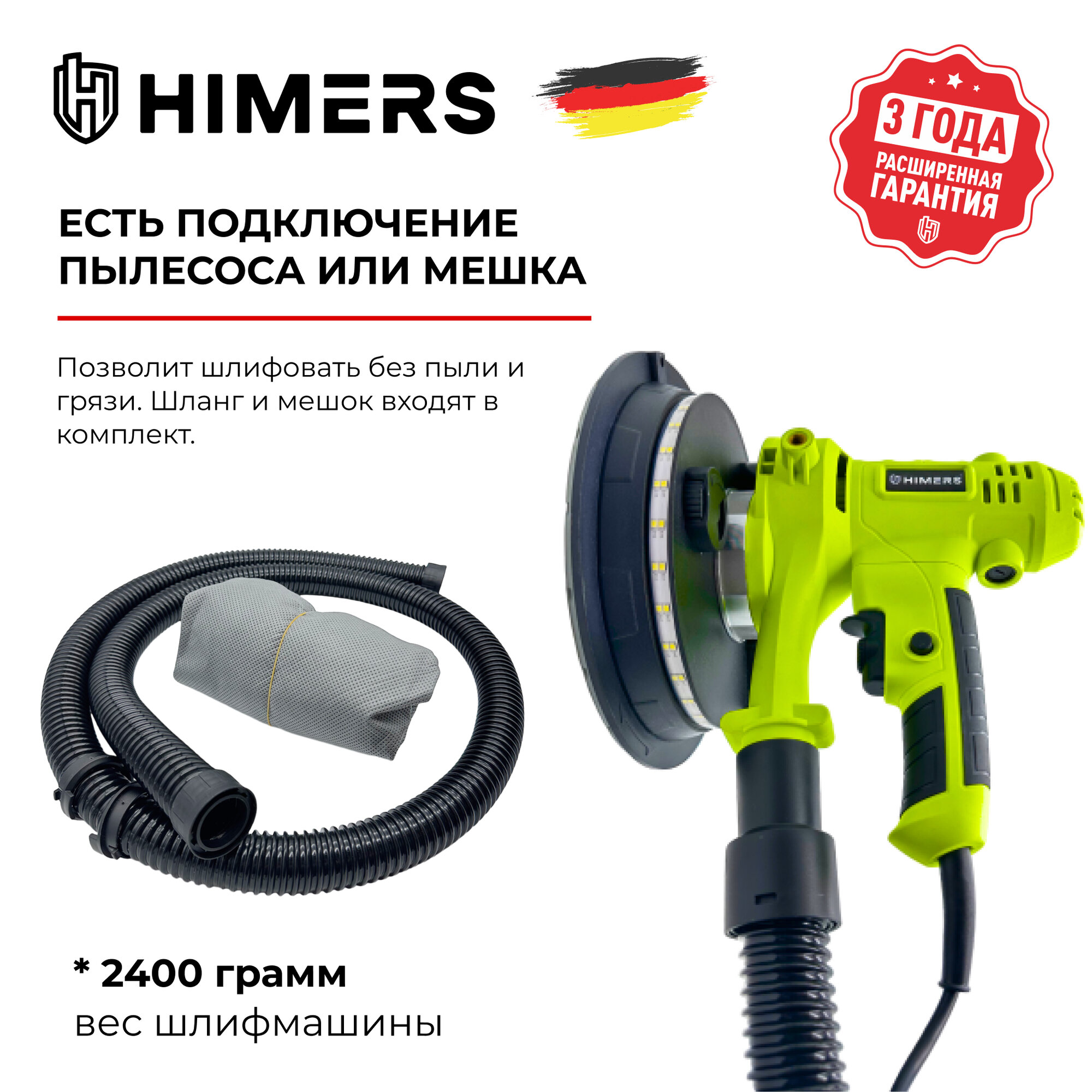 Шлифмашина (жираф) для стен потолка HIMERS SUM1350G, 220V, 1350Вт, 180мм, 450-2750 об/мин., самовсасывающий, подключается пылесос, подсветка интересное: