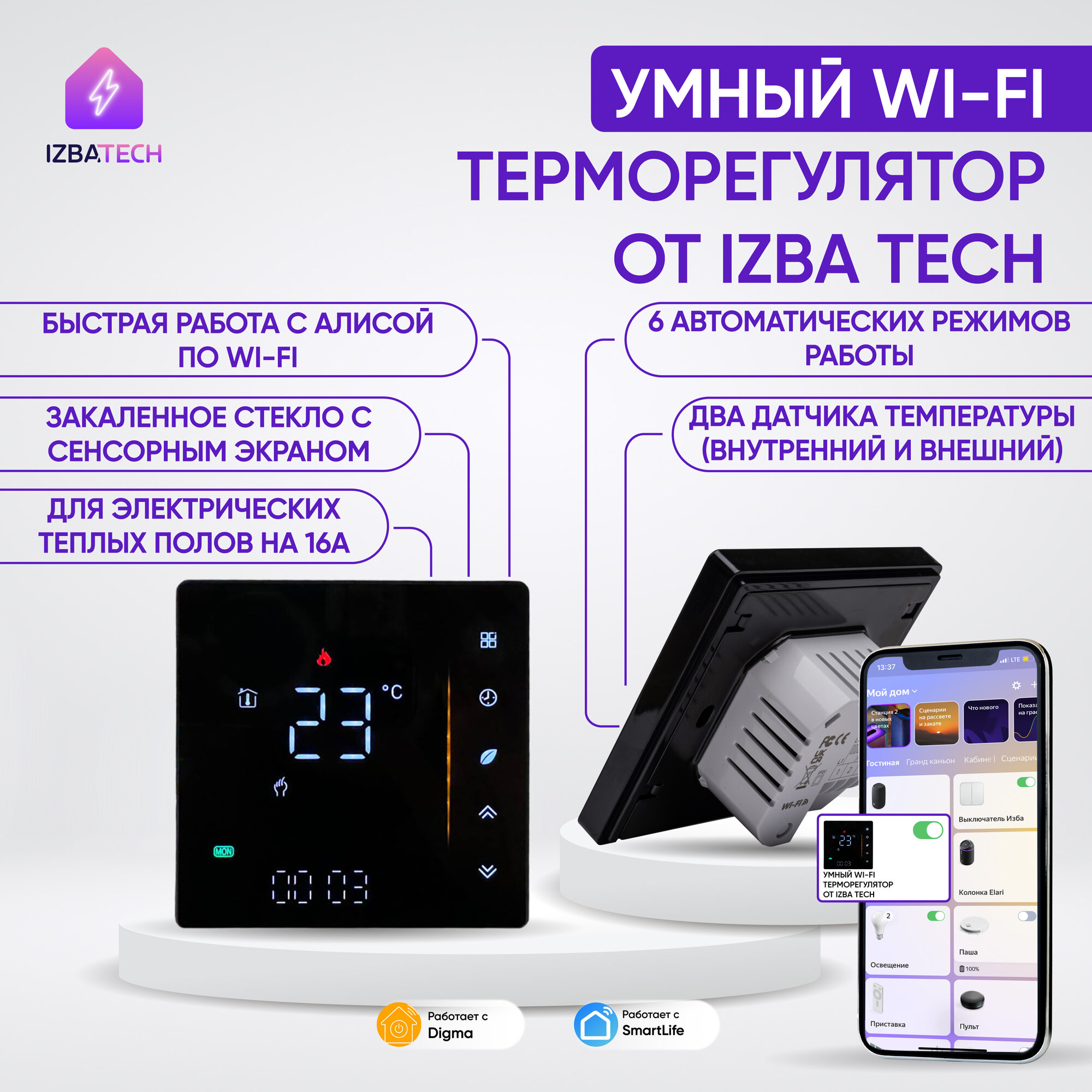 Новый Умный сенсорный терморегулятор для тёплых полов WIFI с Алисой для умного дома в новом дизайне полностью черный термостат на 16А с ЖК экраном интересное: