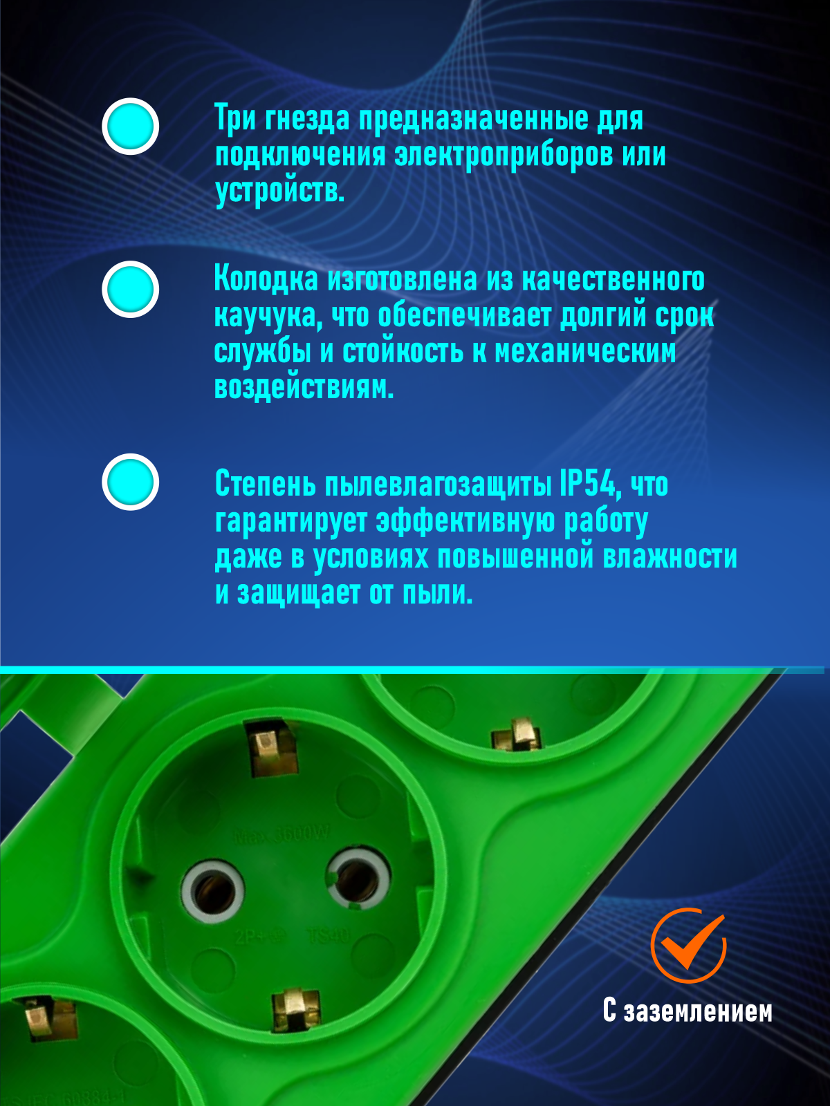 Колодка электрическая для удлинителя колодка трехместная NE-AD 3-нг с/з с крышками 16А, IP54, синий/черный (каучук)
