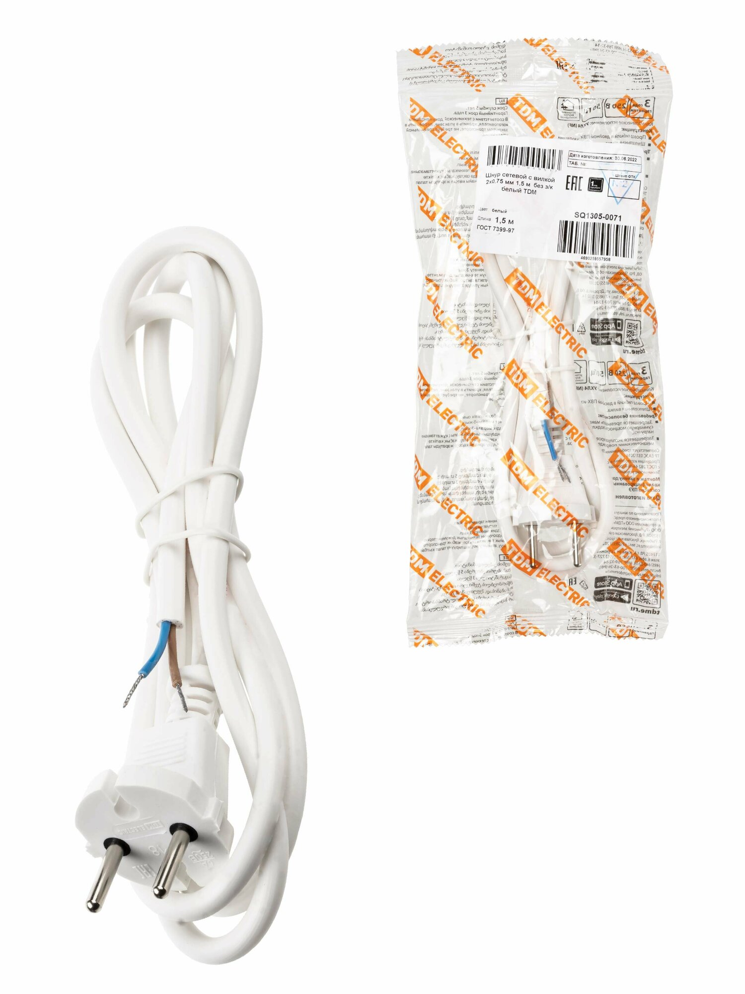 Купить Шнур сетевой с вилкой ПВС 2x0,75мм2 1,5м б/з белый TDM