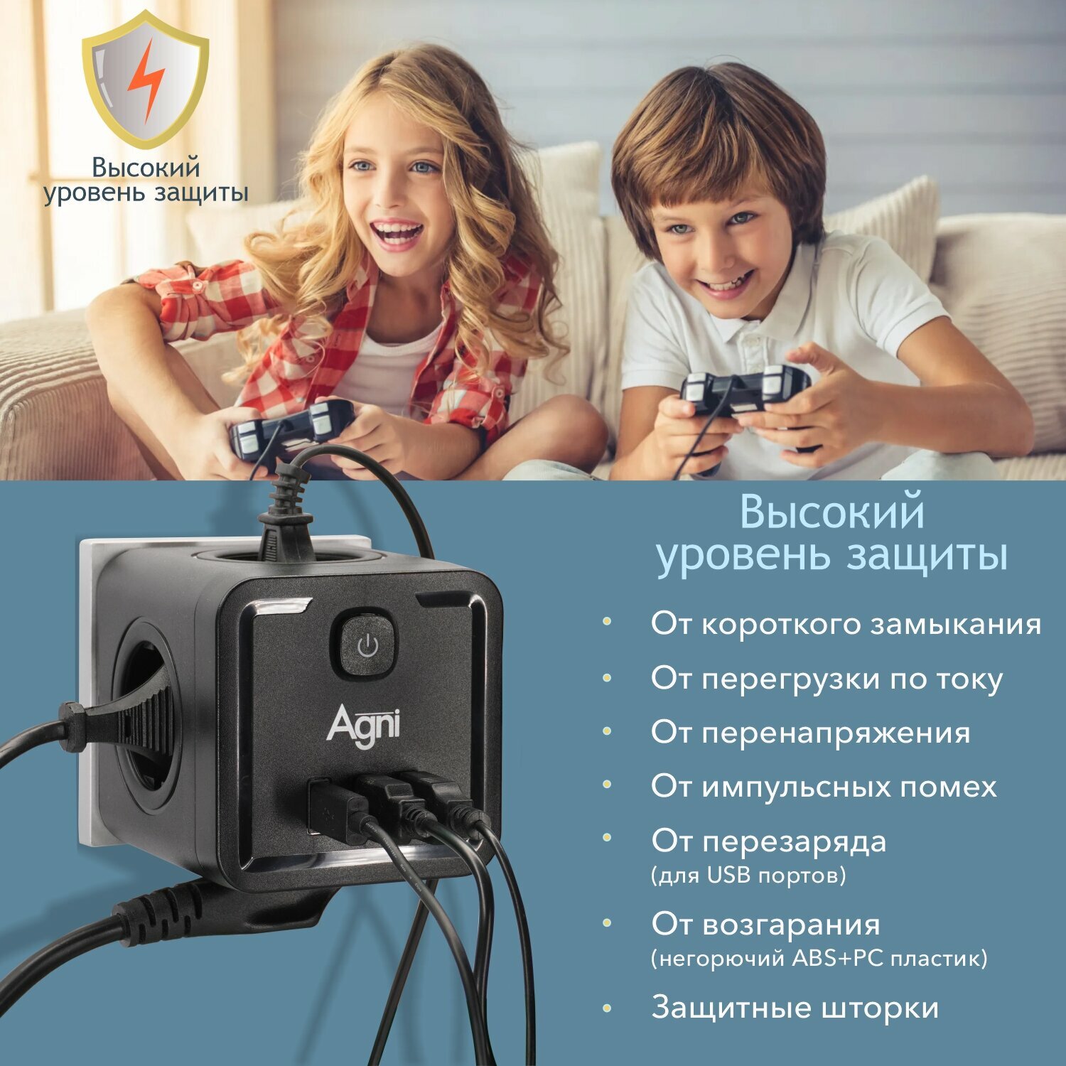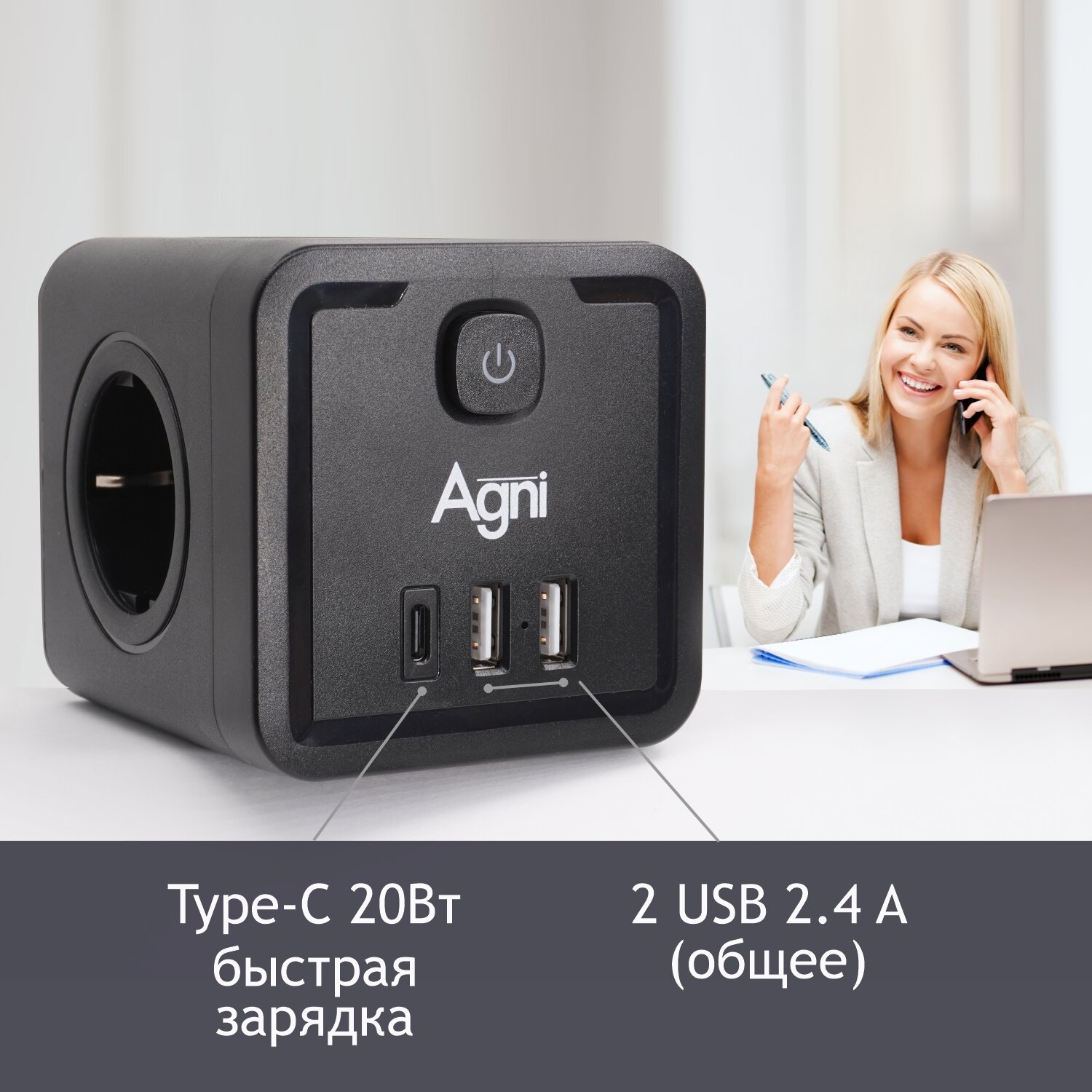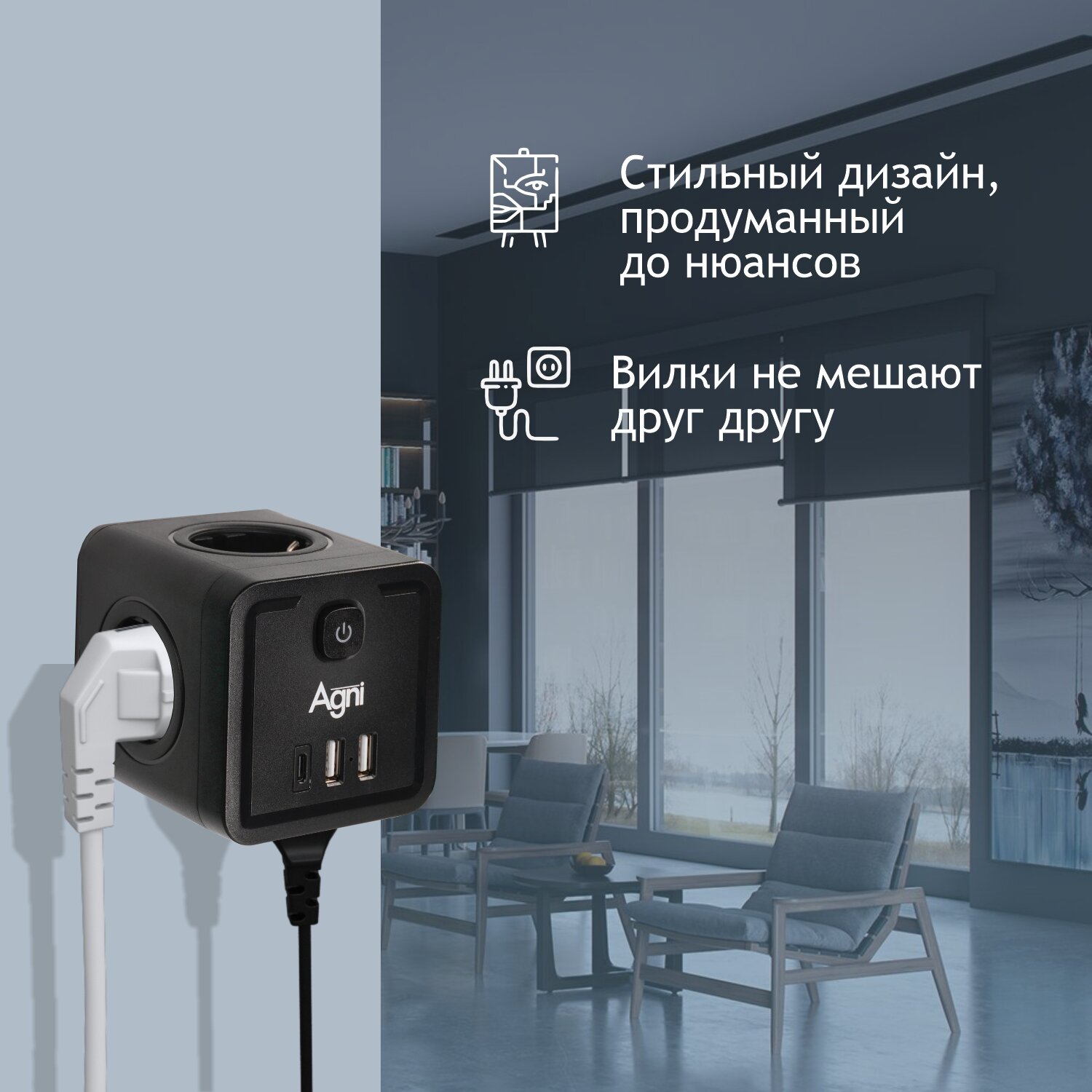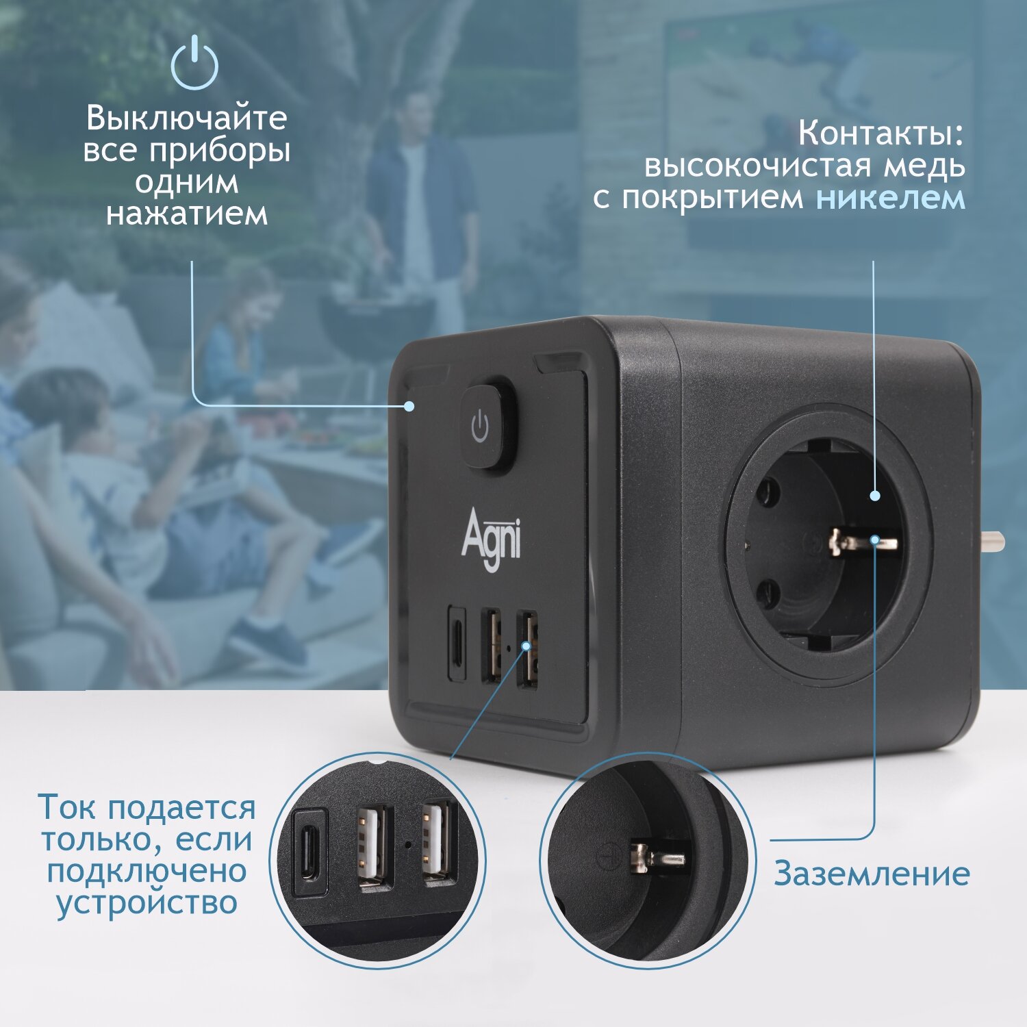 Купить Разветвитель с защитой по типу сетевого фильтра AGNI тройник 4 розетки, 2 USB порта 2.4A, Type-C 20Вт (быстрая зарядка) заземление, шторками, 16A/4кВт(черный)
