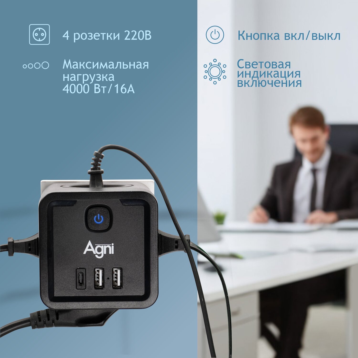 Разветвитель с защитой по типу сетевого фильтра AGNI тройник 4 розетки, 2 USB порта 2.4A, Type-C 20Вт (быстрая зарядка) заземление, шторками, 16A/4кВт(синий)