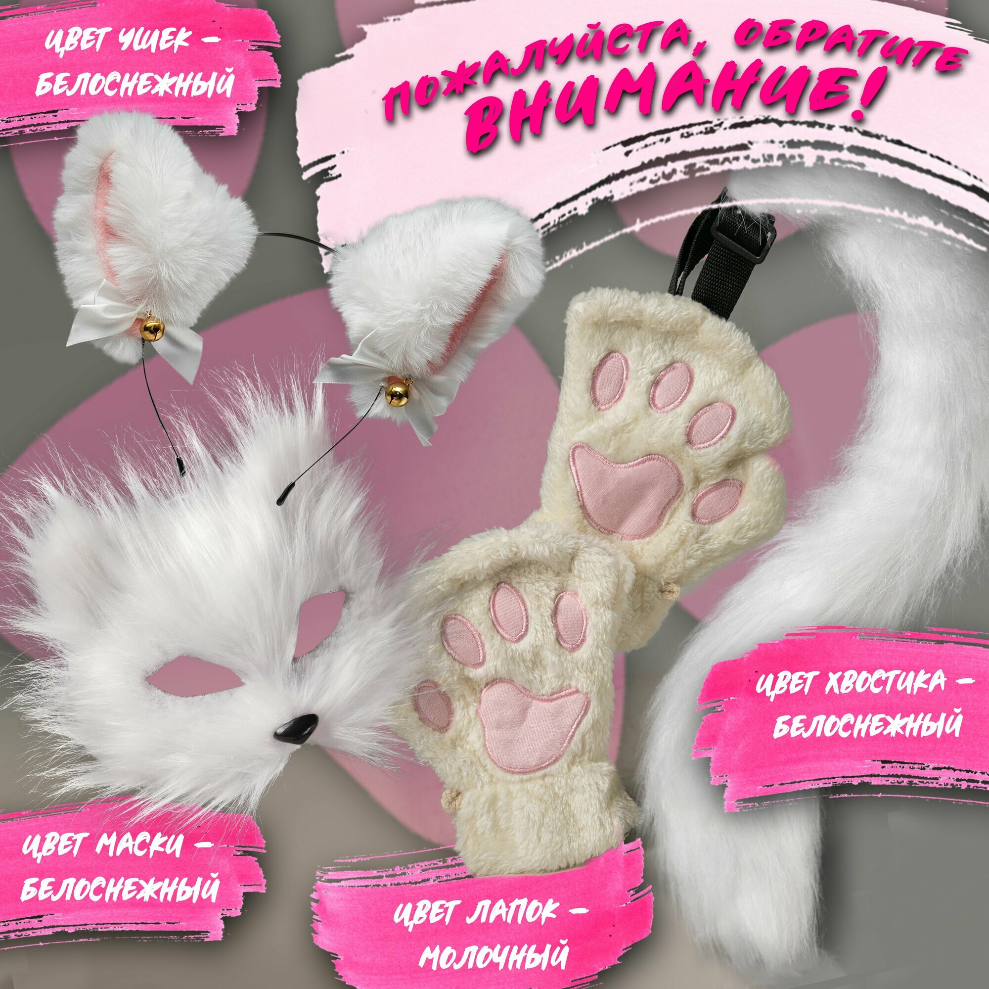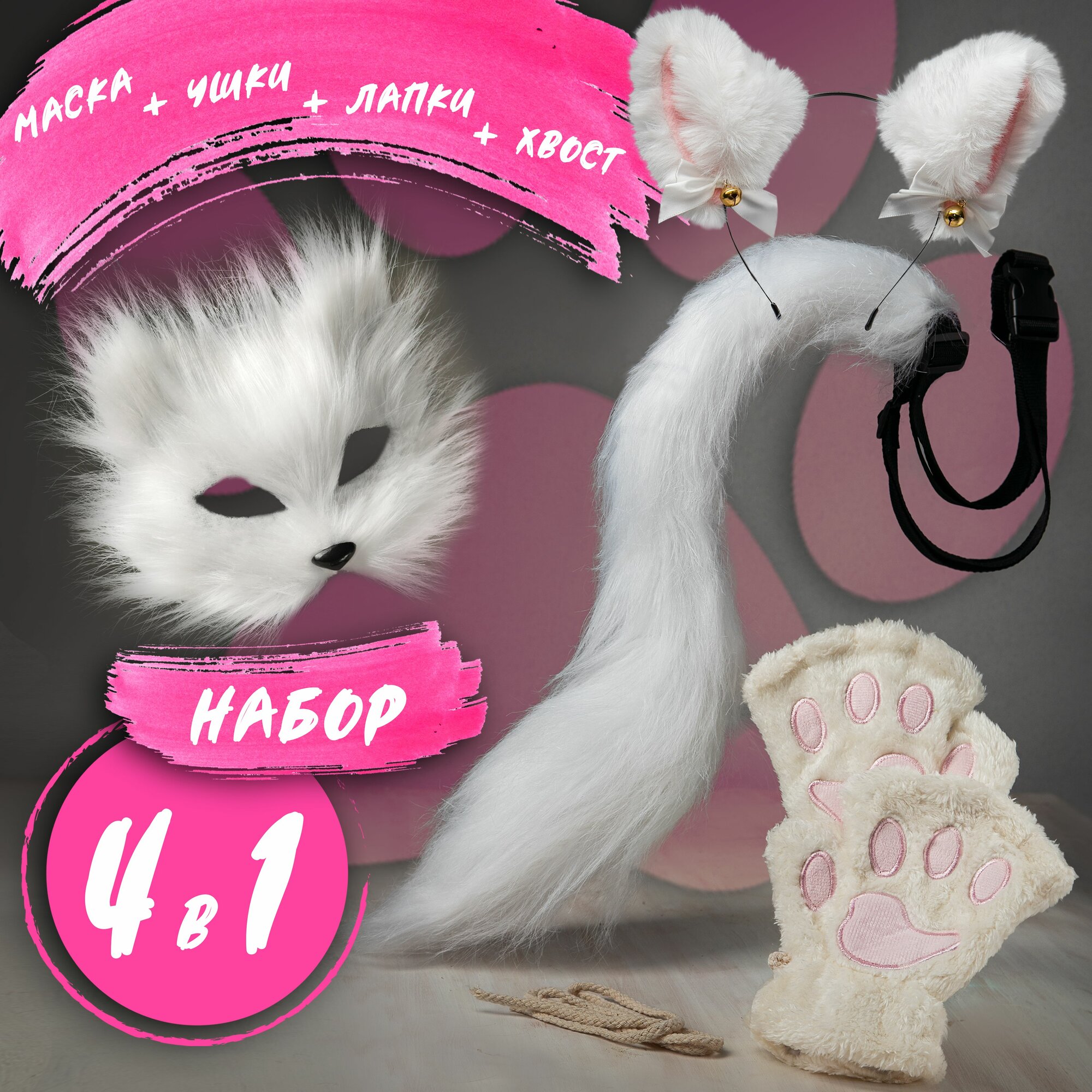 | Цвет товара | 2в1 белый, 2в1 серый, 2в1 черный, 3в1 маска+лапки+хвост белый, 3в1 маска+лапки+хвост черный, 3в1 рыжий, 3в1 серый, 3в1 ушки+лапки+хвост белый, 3в1 черный, 4в1 белый, 4в1 черный, белая маска, белый хвостик, черная маска, черный хвостик |