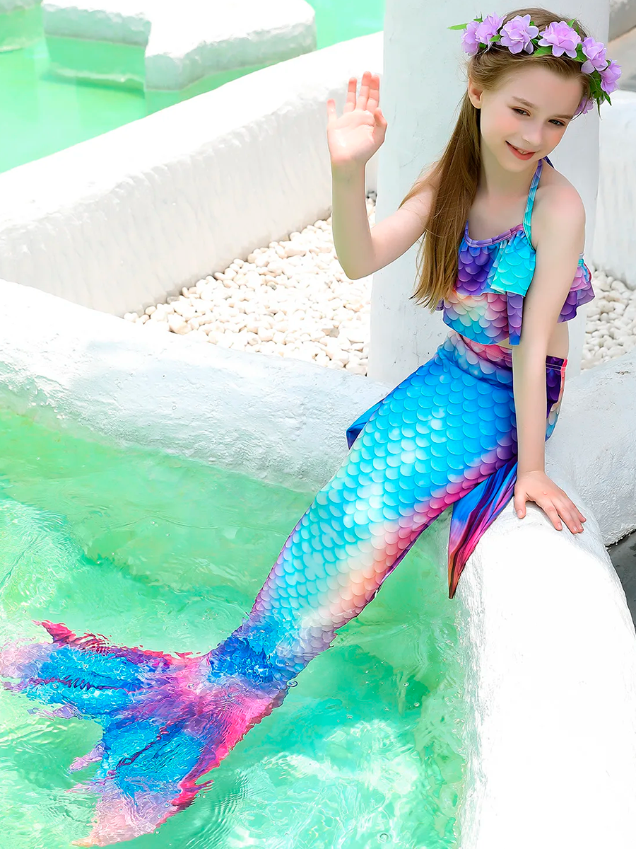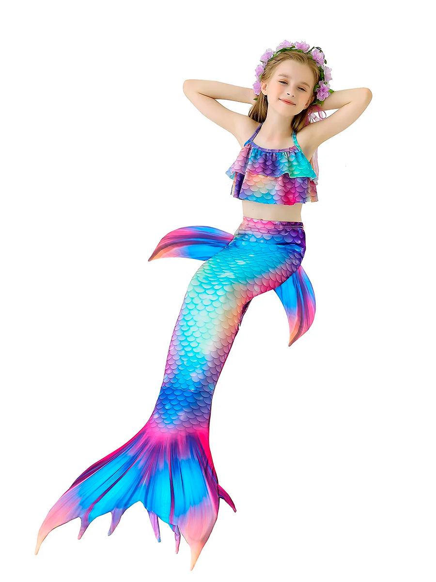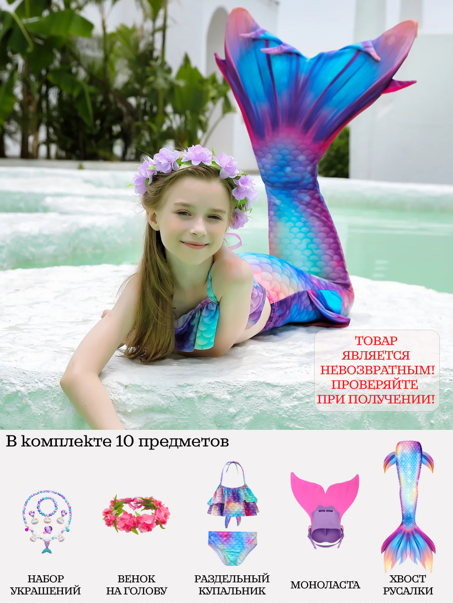 | Комплектация | Раздельный купальник(лиф на завязках), хвост русалки, моноласта, венок на голову с искусственными цветами и зеленью, набор аксессуаров. |