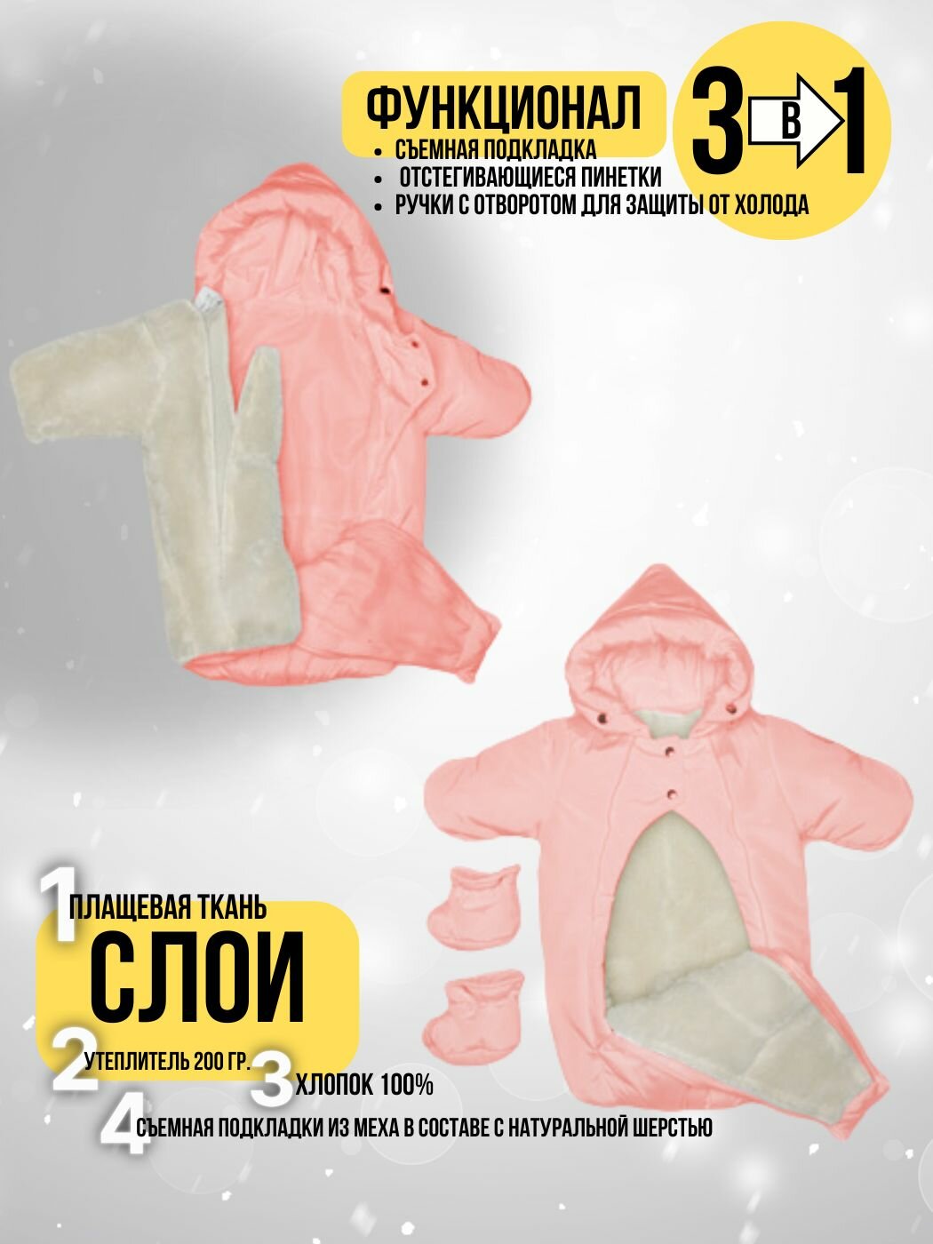 Комбинезон-конверт "трансформер", Зима, подклад с содержанием шерсти отстёгивается, Коралловый арт. 147шм (62 см)