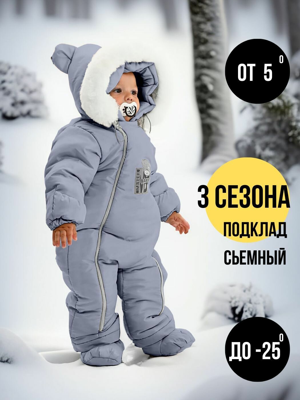 | Особенности модели | ветрозащита, водонепроницаемый, капюшон, мембрана, пинетки в комплекте, подкладка, съемный капюшон, ушки |
