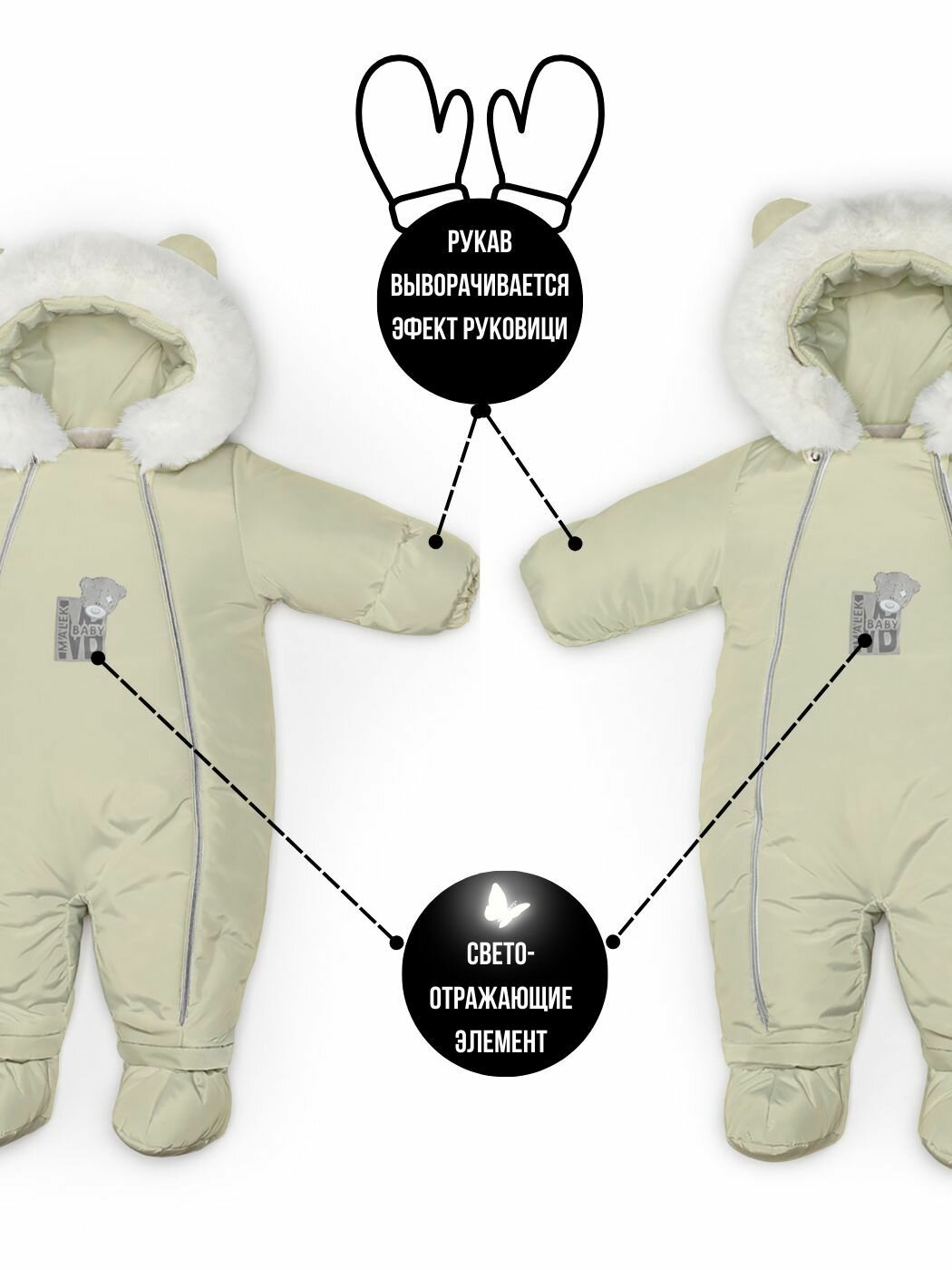 | Особенности модели | ветрозащита, водонепроницаемый, капюшон, мембрана, пинетки в комплекте, подкладка, съемный капюшон, ушки |
