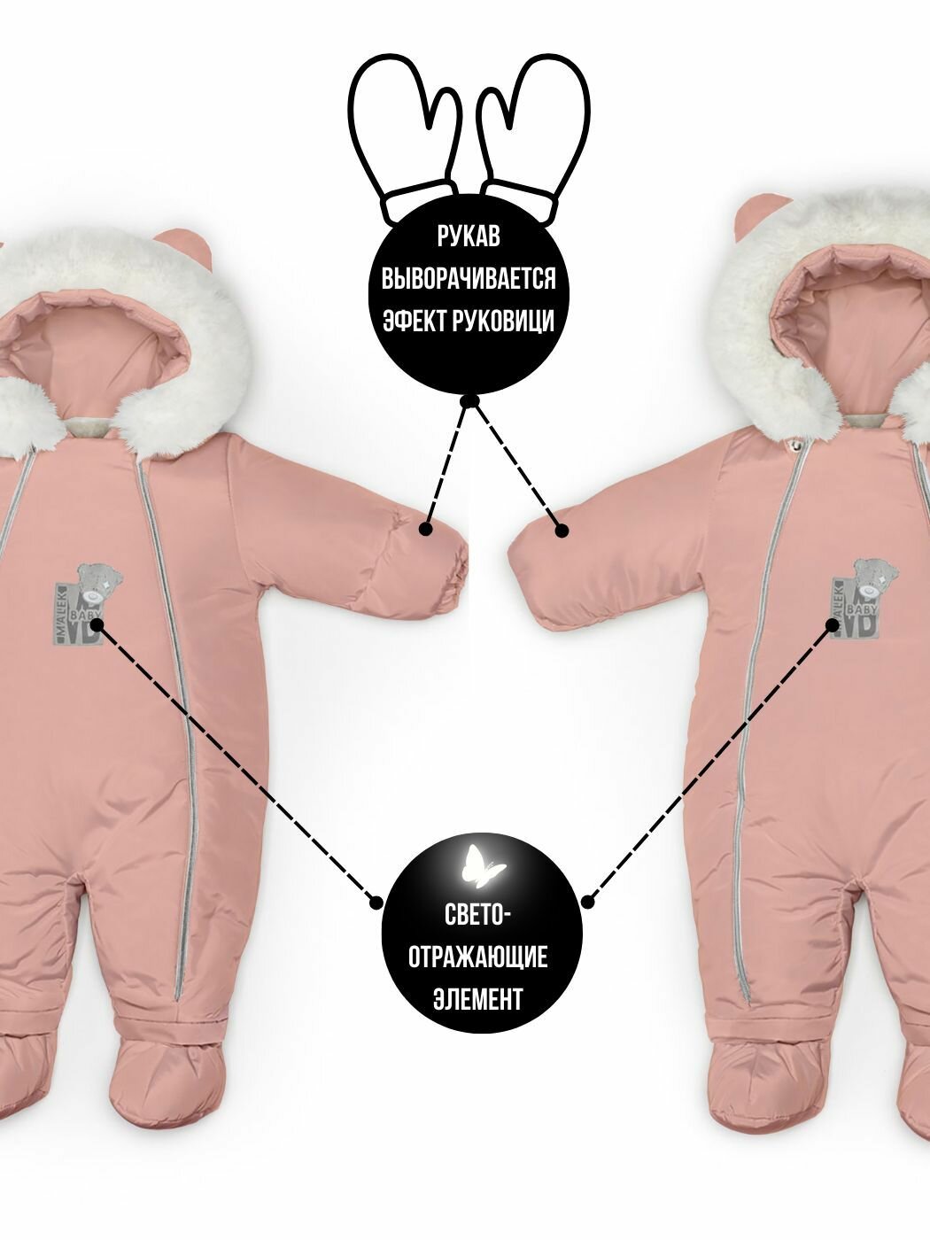 | Особенности модели | ветрозащита, водонепроницаемый, капюшон, мембрана, пинетки в комплекте, подкладка, съемный капюшон, ушки |