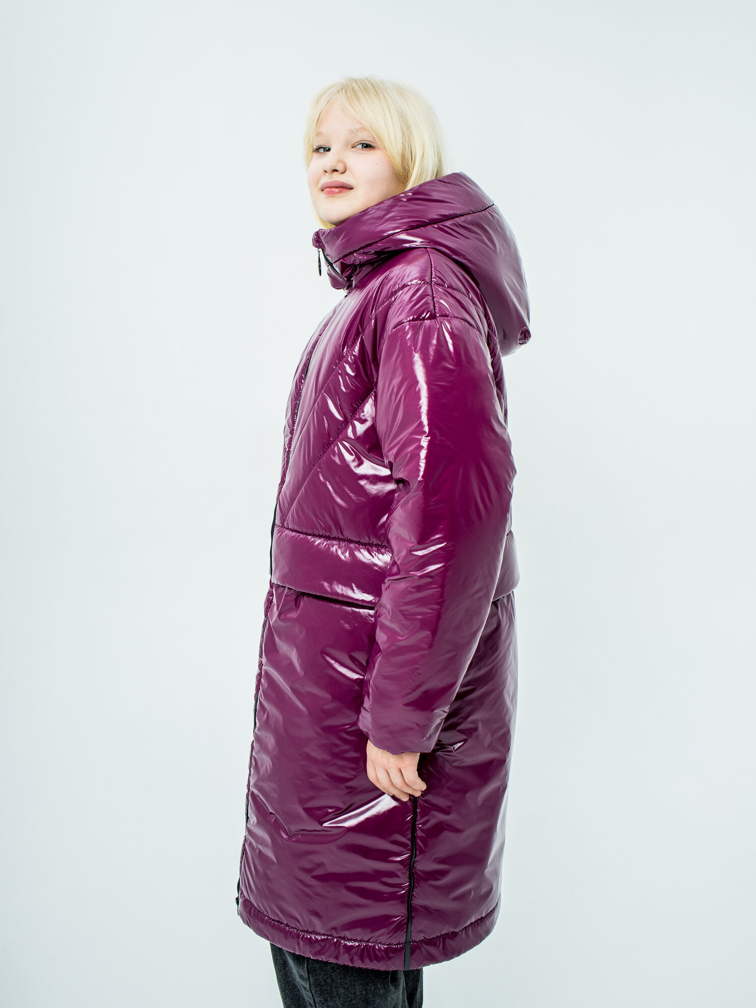 Пальто демисезонное утепленное с капюшоном баклажановое 146