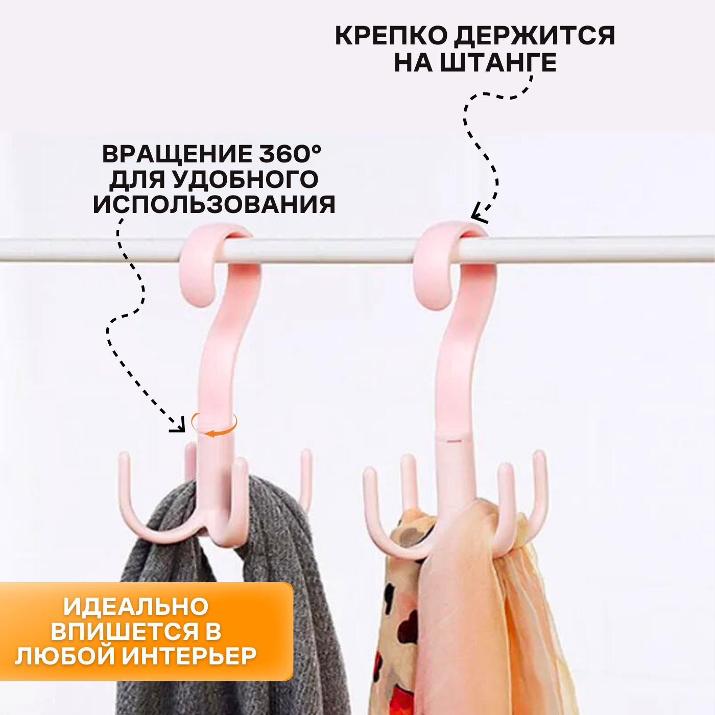 Вешалка для шкафа с вращением, Поворотный крючок органайзер для одежды, ремней, сумок, платков, шарфов (розовый) интересное: