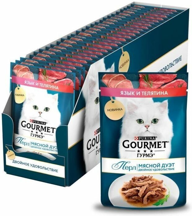Гурмэ перл мясной дуэт для взрослых кошек нежное филе с языком и телятиной в соусе пауч 75 гр NEW 75 гр х 10 шт