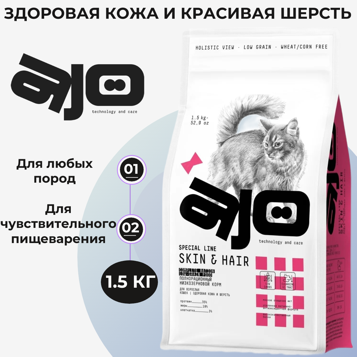 Купить Сухой низкозерновой корм для взрослых кошек AJO Skin & Hair Здоровая кожа и красивая шерсть, 1,5 кг