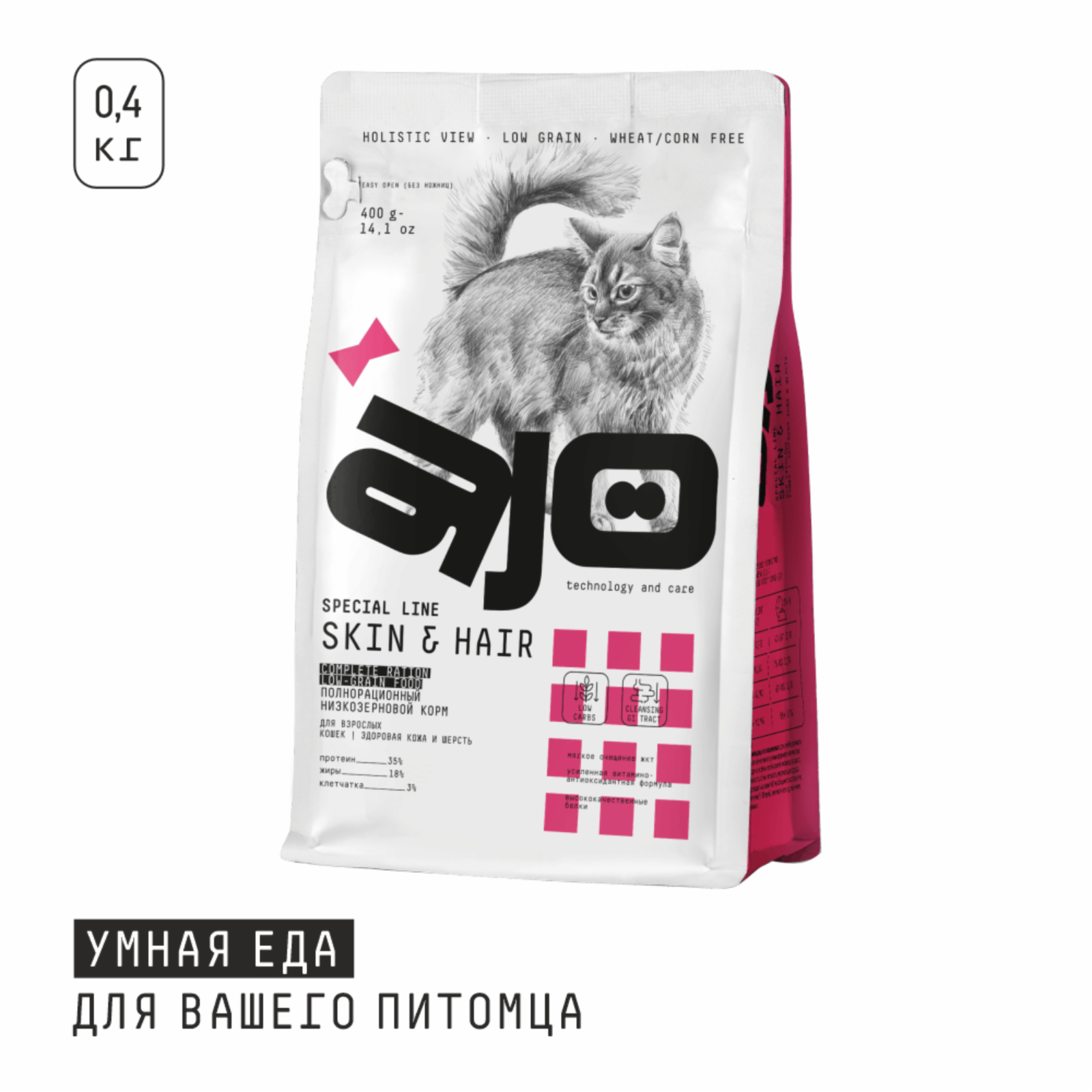 Сухой корм AJO Cat Skin & Hair для кошек здоровая кожа и красивая шерсть 0,4 кг
