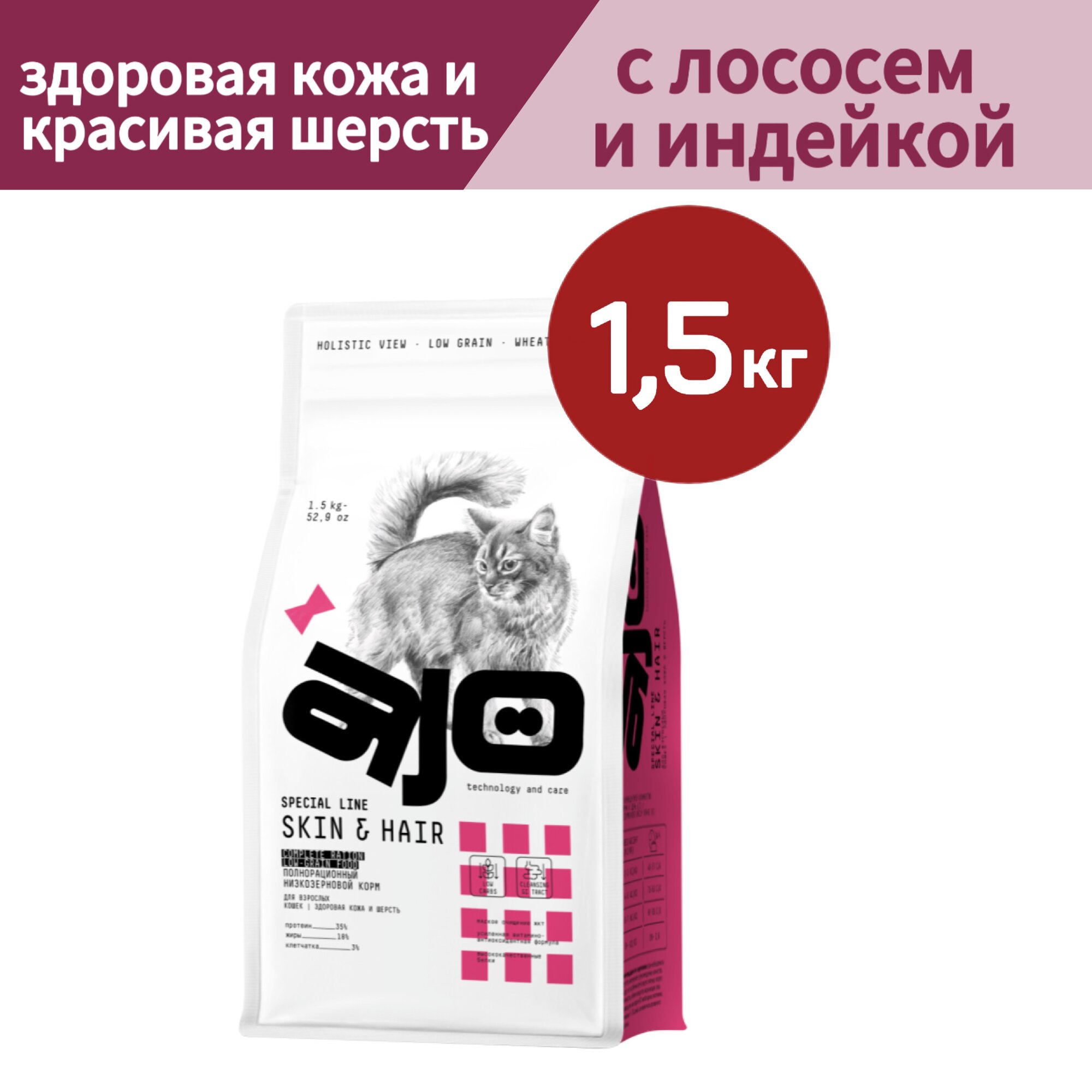 Сухой корм AJO Cat Skin & Hair для кошек, здоровая кожа и красивая шерсть, с лососем и индейкой, 1,5 кг
