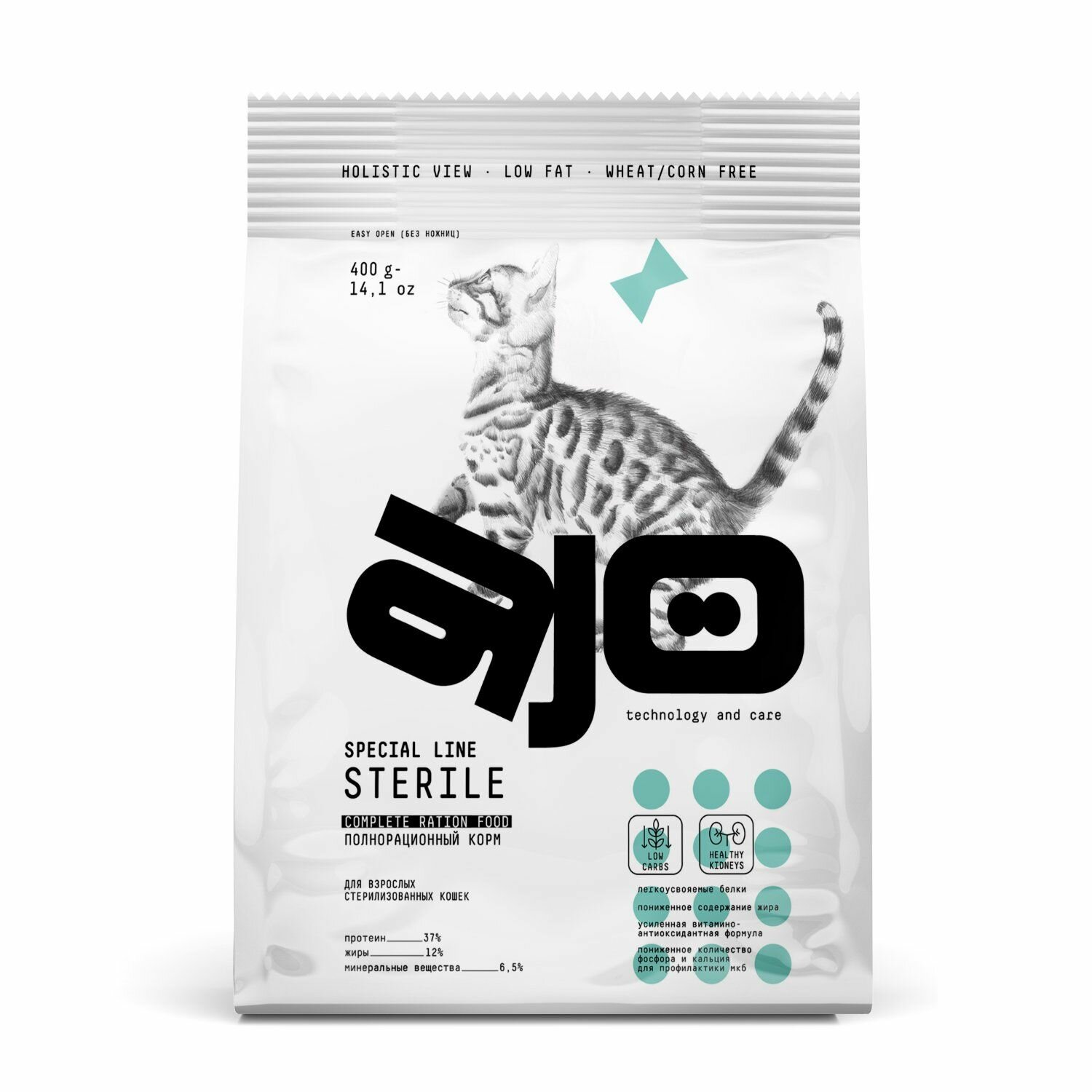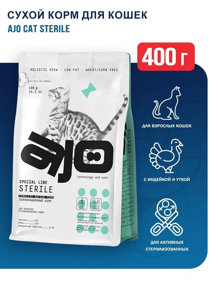 Корм для кошек сухой AJO / Айо Cat Sterile для взрослых стерилизованных животных, гранулы 400г / кошачья еда для ежедневного кормления