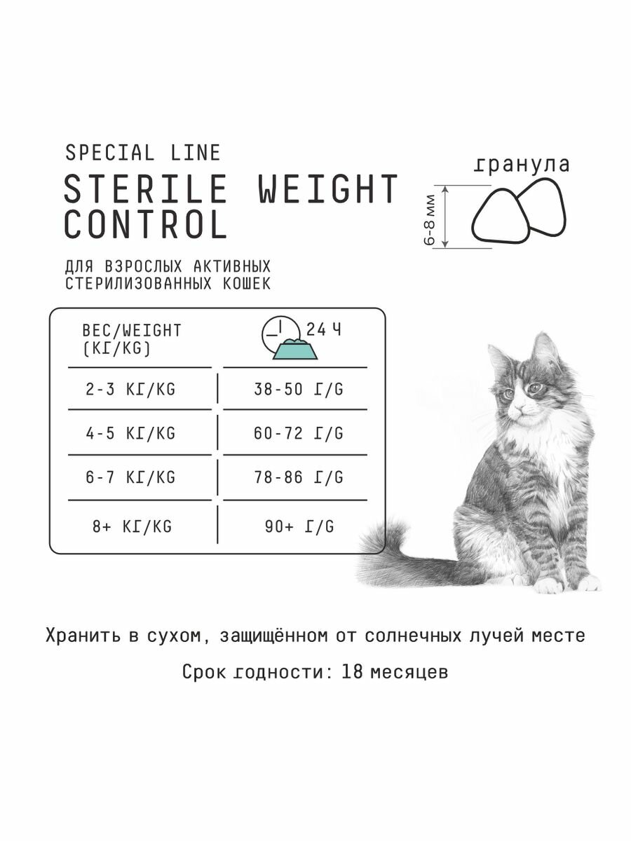 | Особые потребности | беззерновой / гипоаллергенный / для беременных / кормящих кошек / для вывода шерсти / для живущих в помещении / для живущих на улице / для здоровья кожи и блеска шерсти / для здоровья костей и суставов / для профилактики стресса / для снижения запаха стула / для стерилизованных/кастрированных / при диабете / при чувствительном пищеварении / профилактика МКБ / профилактика зубного камня / профилактика избыточного веса |