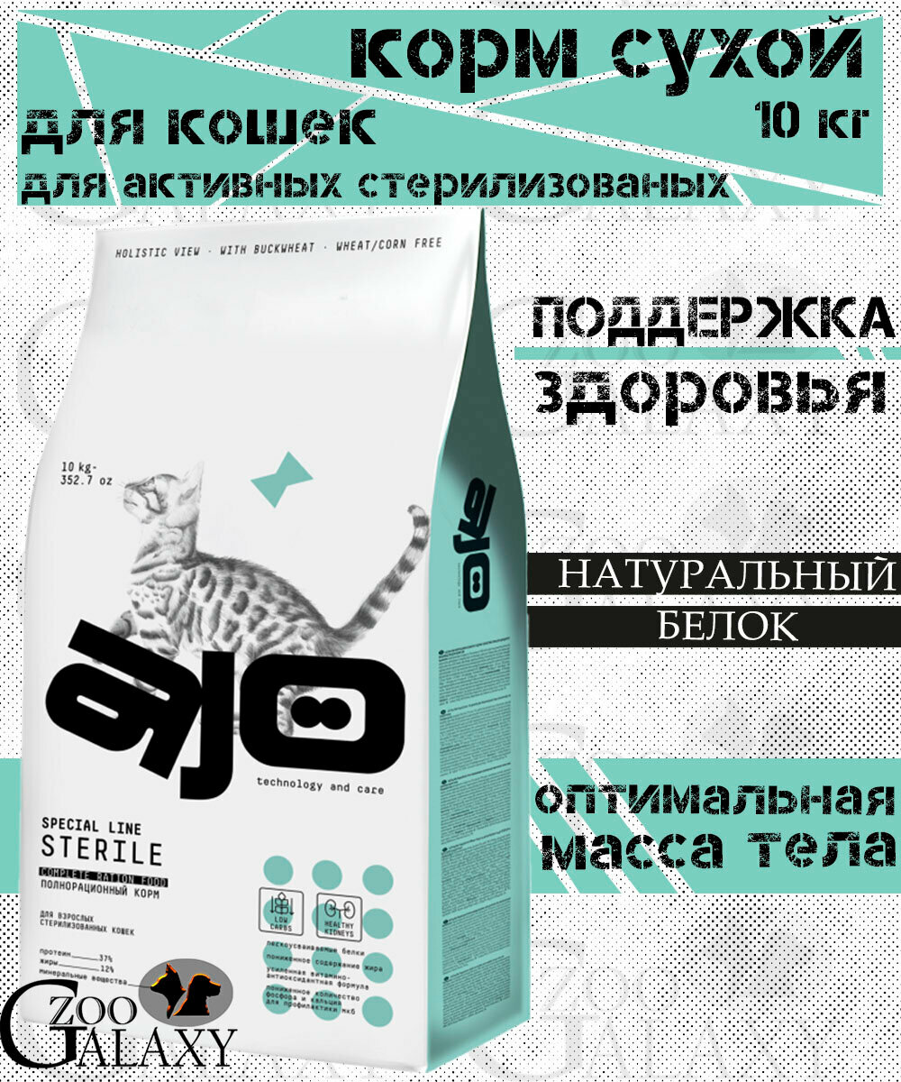 AJO Cat Sterile Сухой полнорационный корм для активных стерилизованных кошек с высоким содержанием белка 10 кг