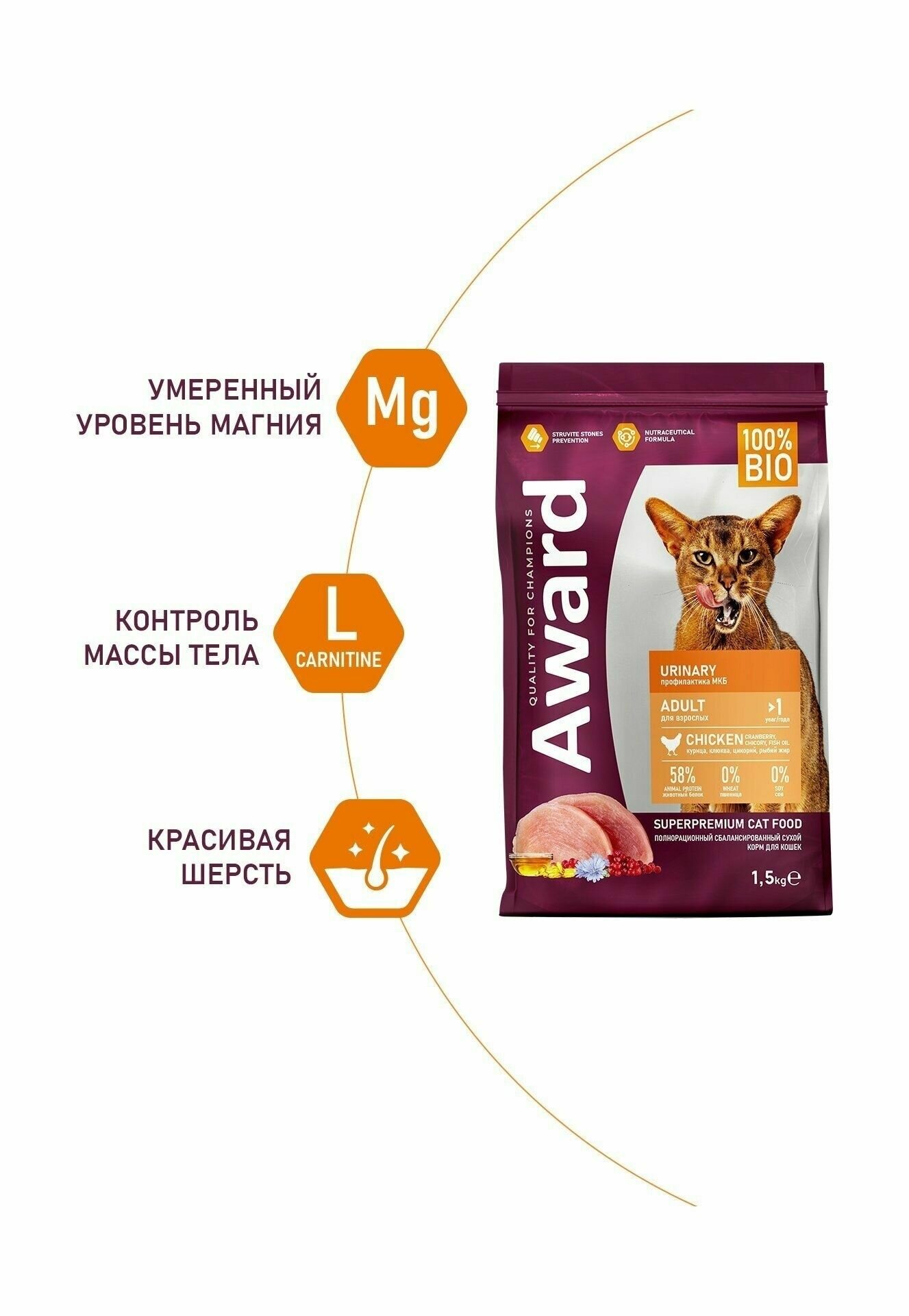 Купить AWARD Urinary сухой корм для взрослых кошек, для профилактики мочекаменной болезни, с курицей, клюквой, цикорием и рыбьим жиром - 1,5 кг