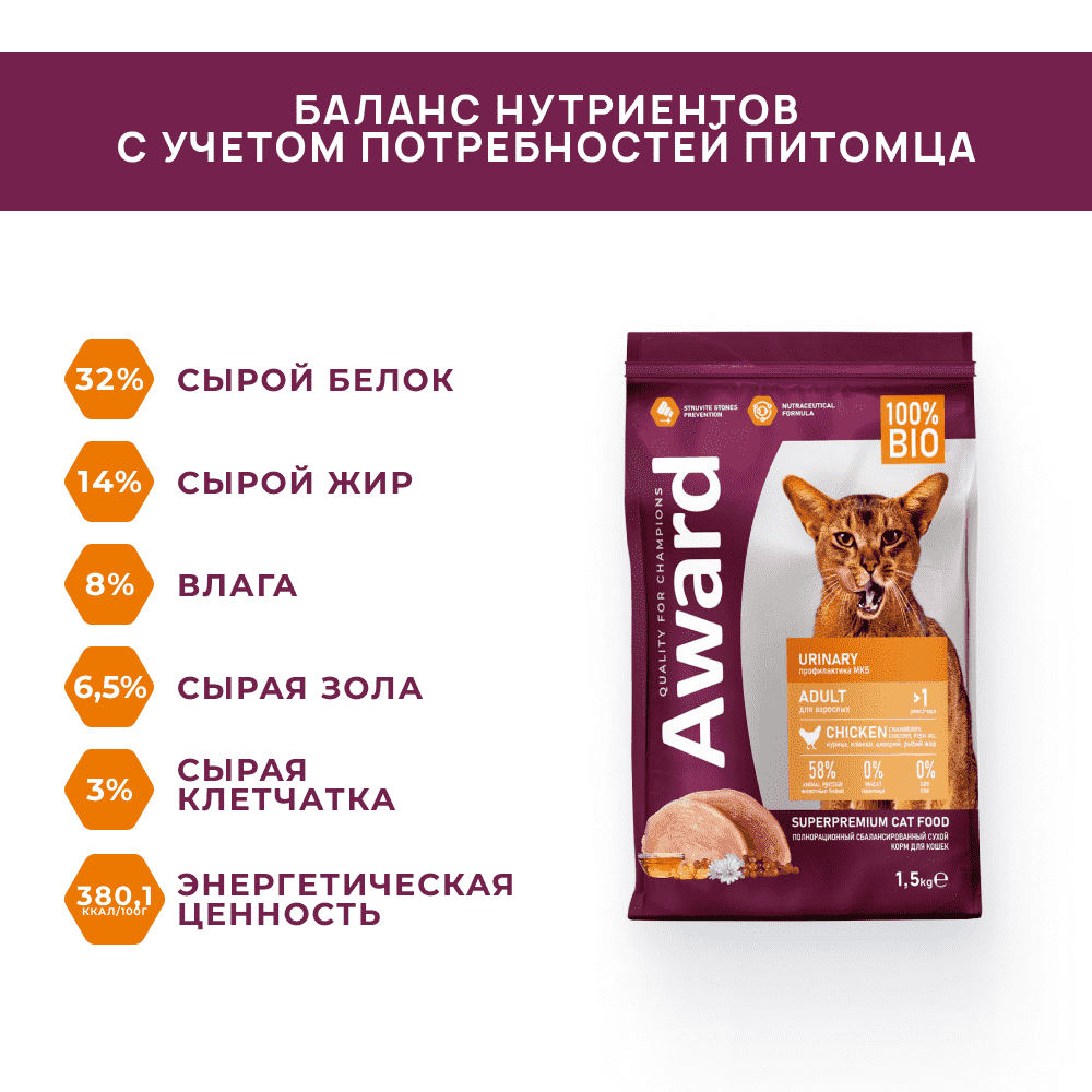 Award сухой корм для кошек для профилактики МКБ с курицей, 1,5 кг