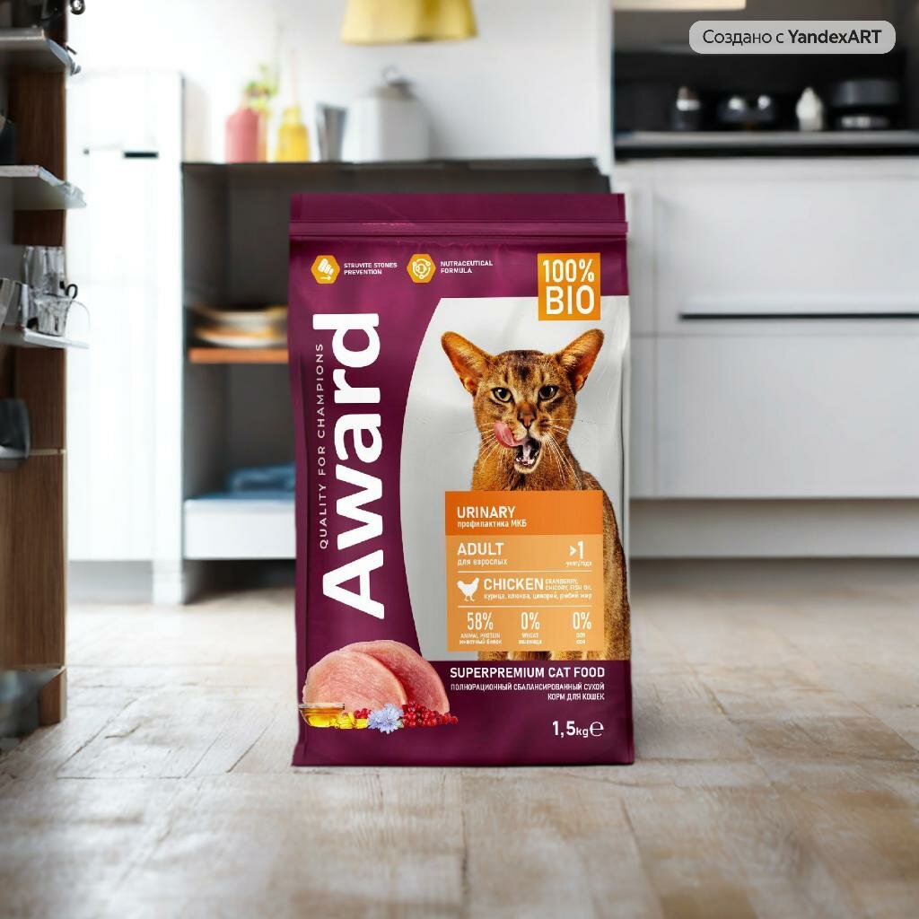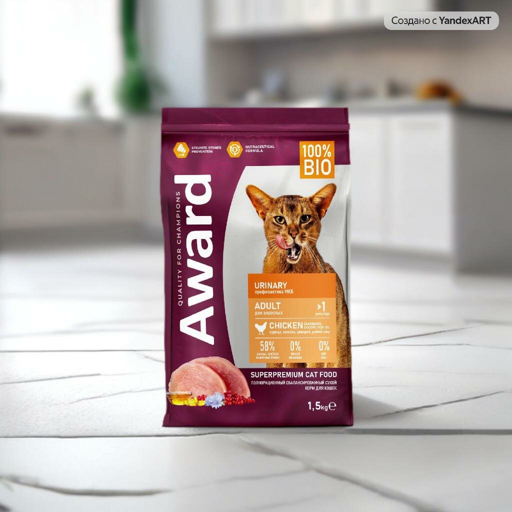 Сухой корм AWARD Urinary для взрослых кошек для профилактики мочекаменной болезни с курицей с добавлением клюквы, цикория и рыбьего жира 1,5кг