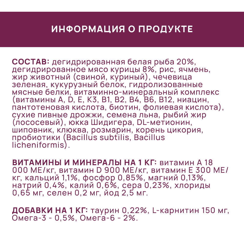 | Особые потребности | беззерновой / гипоаллергенный / для беременных / кормящих кошек / для вывода шерсти / для живущих в помещении / для живущих на улице / для здоровья кожи и блеска шерсти / для здоровья костей и суставов / для стерилизованных/кастрированных / при чувствительном пищеварении / профилактика МКБ / профилактика избыточного веса |