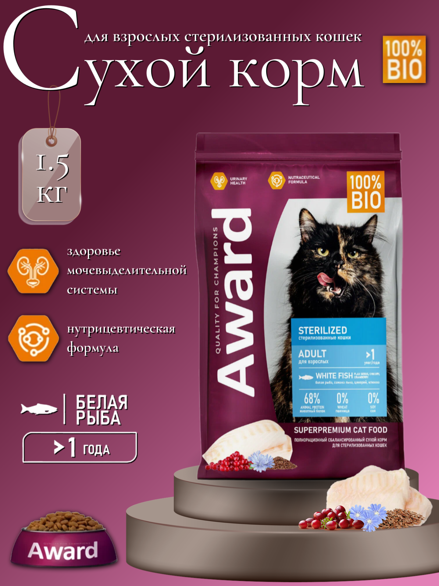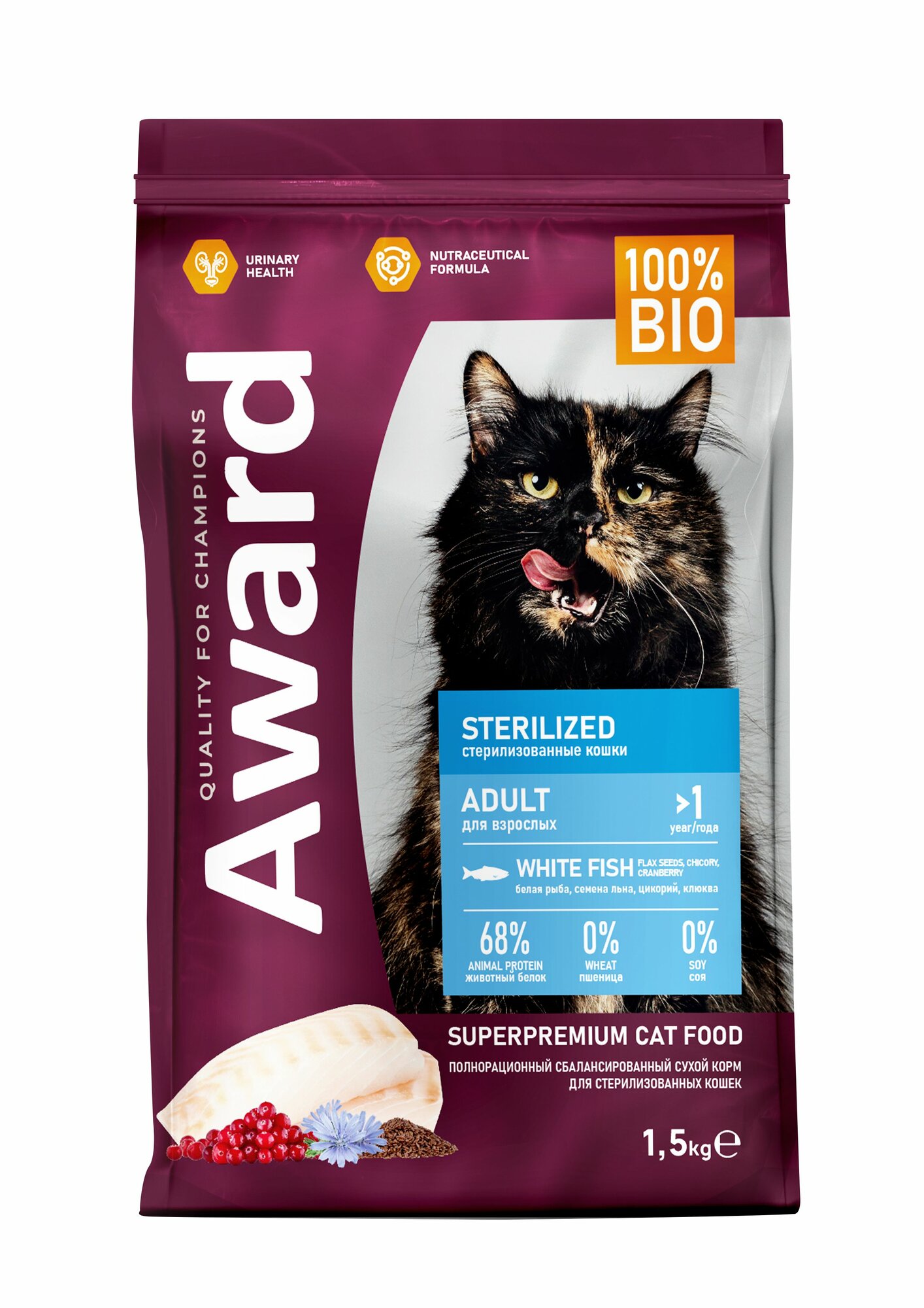 Сухой корм 1.5 кг с белой рыбой AWARD "Sterilized" для стерилизованных кошек, 1 упаковка
