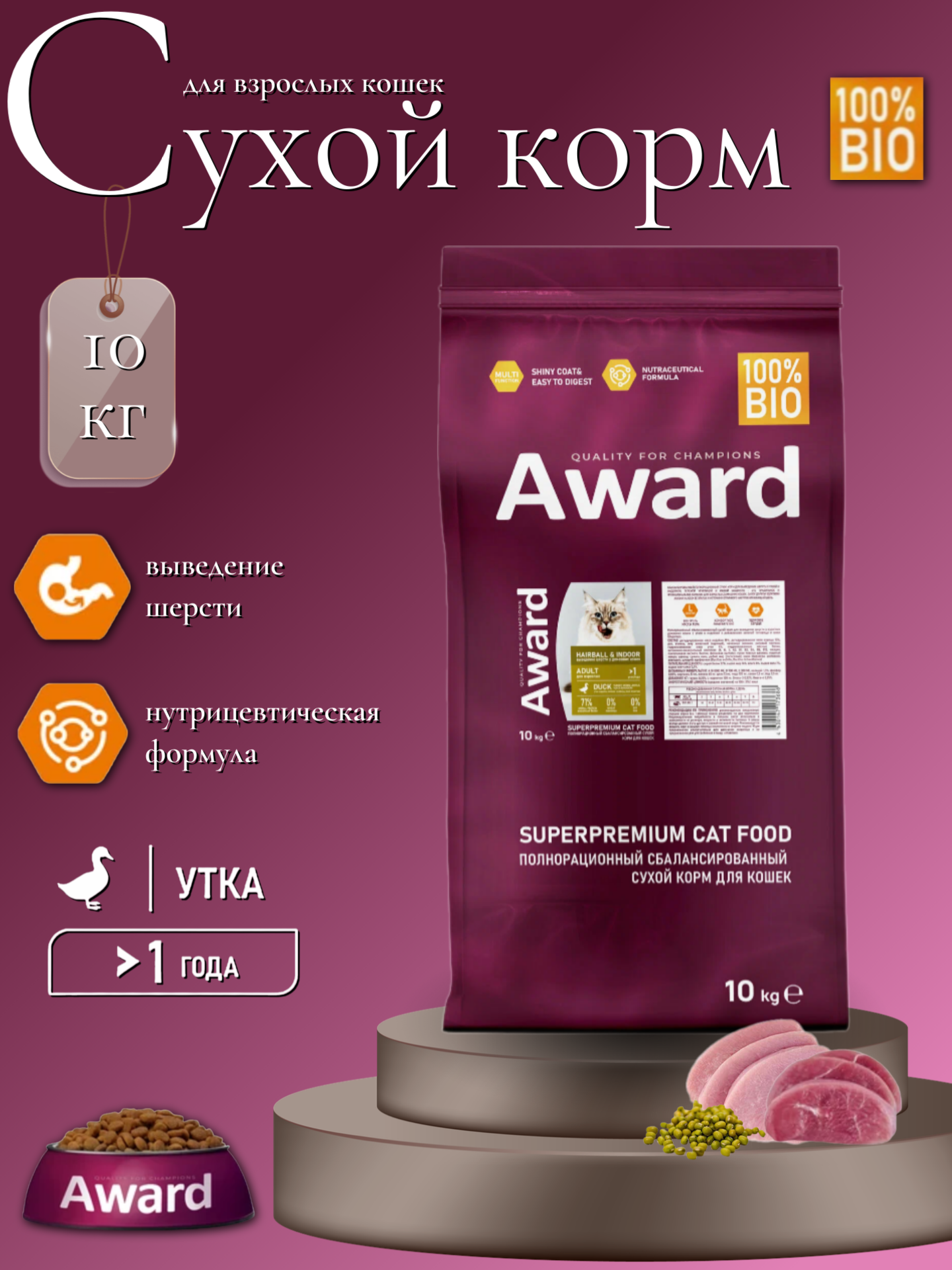 Сухой корм AWARD Hairball & Indoor для взрослых кошек для выведения шерсти с уткой и индейкой 10кг
