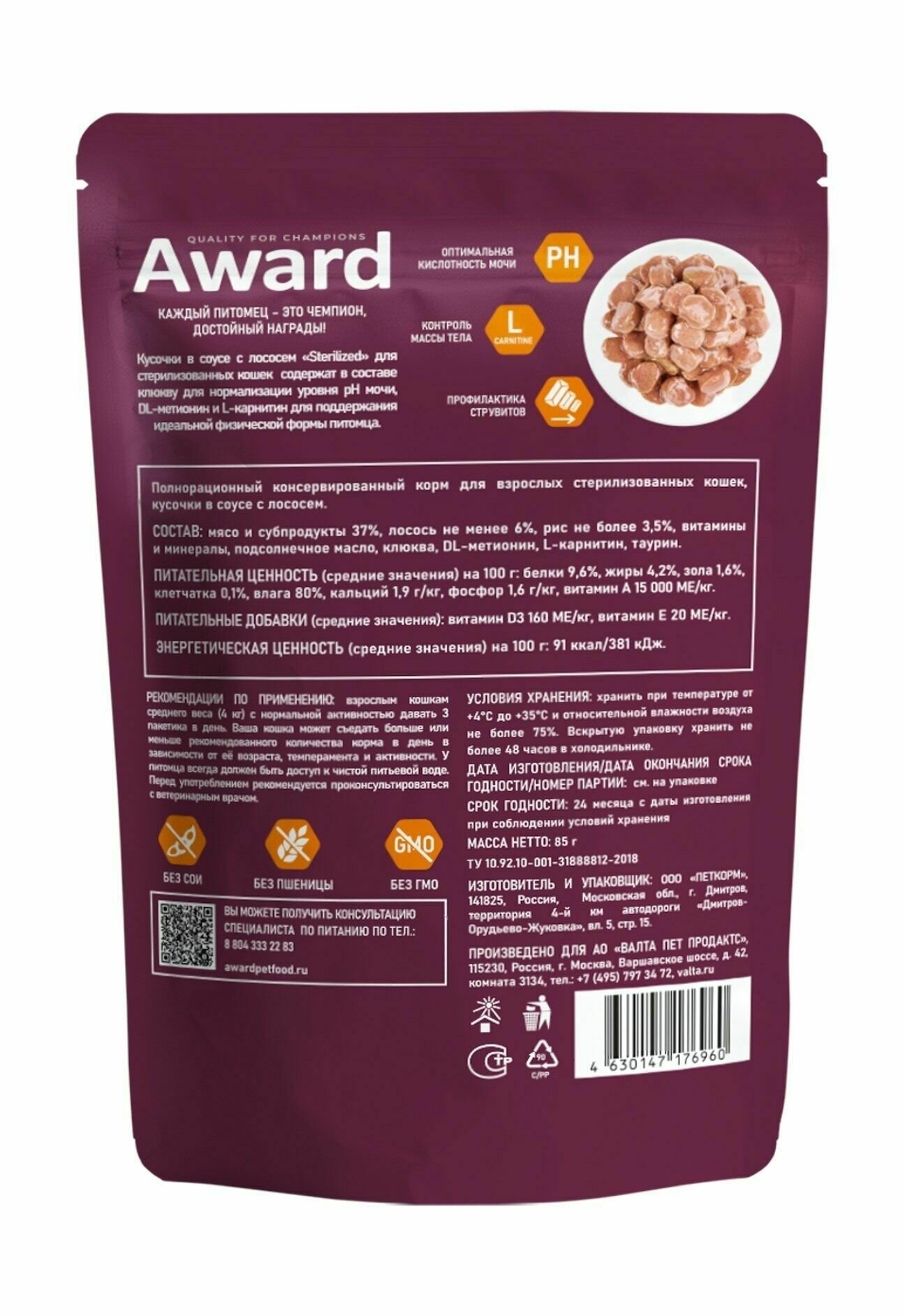 Купить AWARD Sterilized влажный корм для взрослых стерилизованных кошек, кусочки в соусе с лососем, в паучах - 85 г х 24 шт