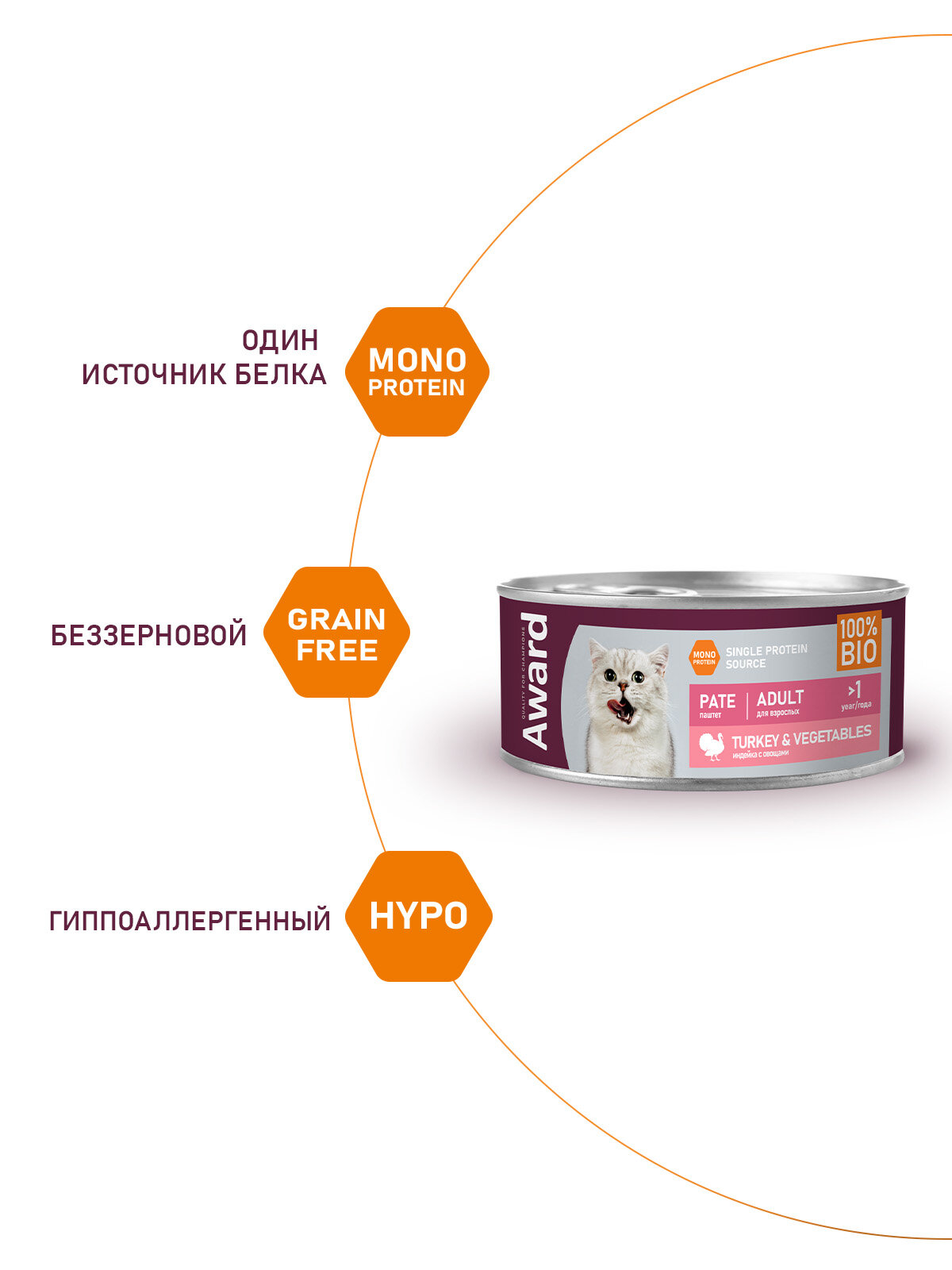 Влажный корм AWARD для взрослых кошек паштет из индейки с овощами 100г * 16 шт