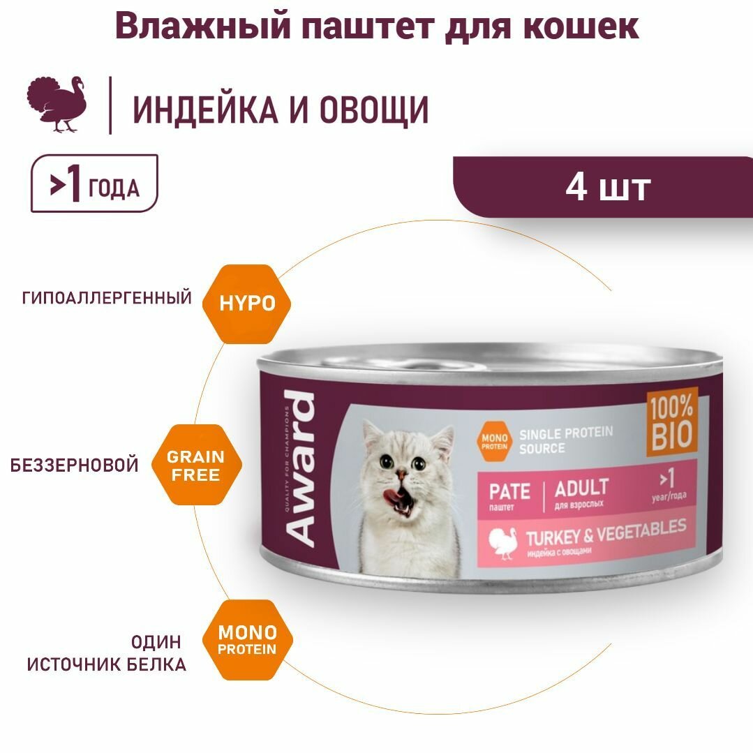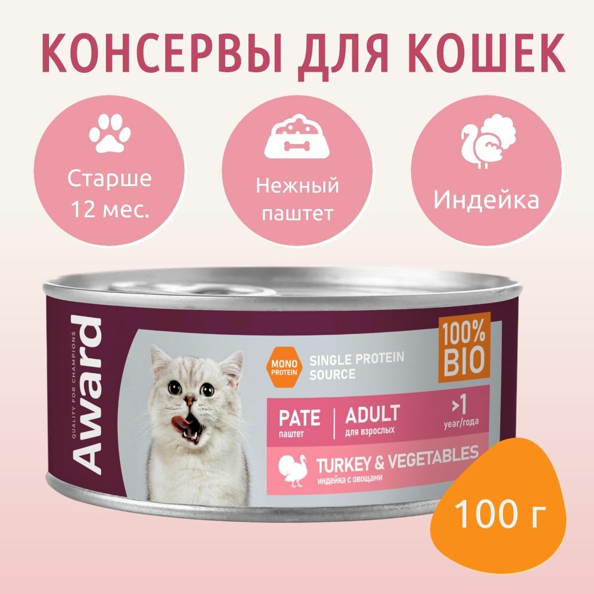 AWARD TURKEY & VEGETABLES для взрослых кошек паштет с индейкой и овощами банка 100 гр 100 гр х 6 шт
