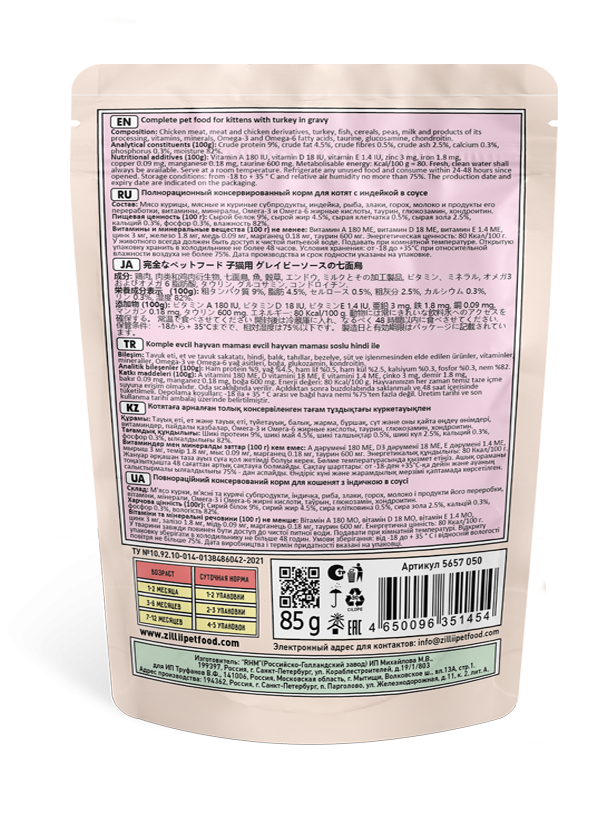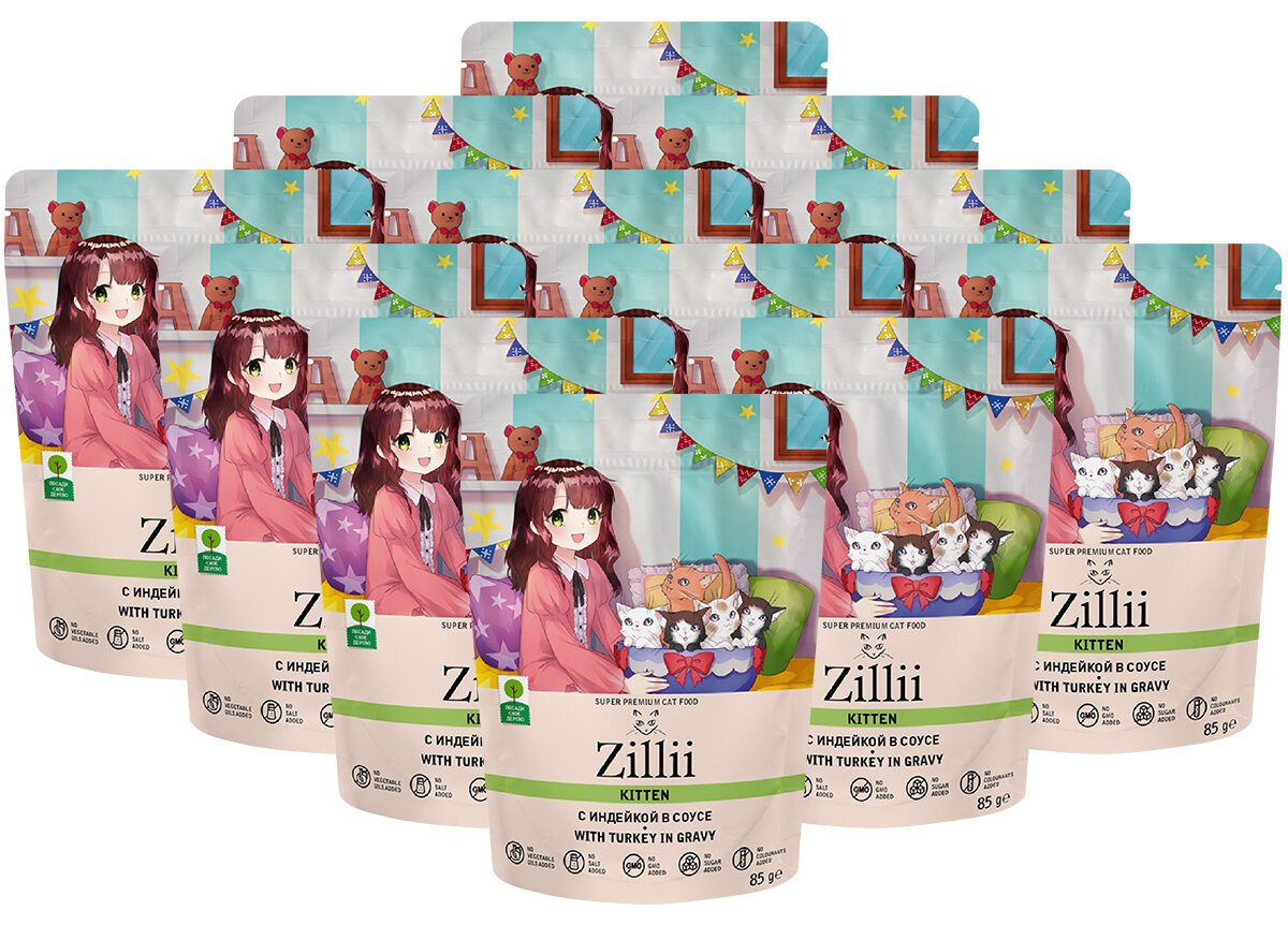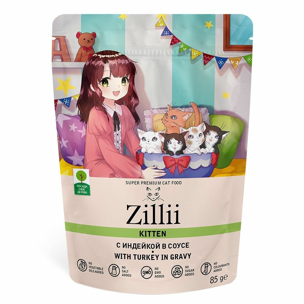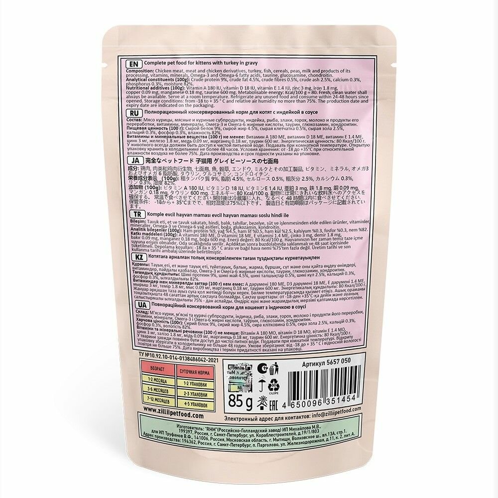 Корм для котят влажный ZILLII (Зиллии) Kitten (пауч) 12шт - 85г, Индейка в соусе интересное: